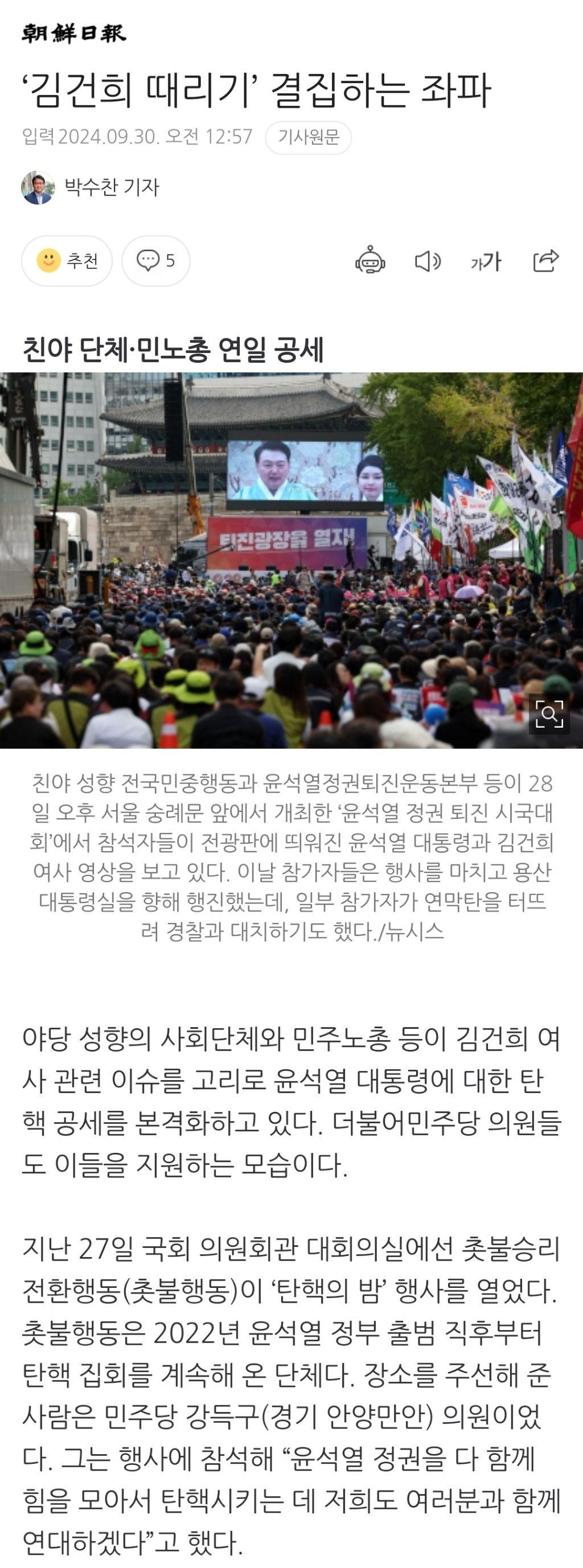 [스크랩] [여시뉴스데스크]‘김건희 때리기’ 결집하는 좌파 작성자천리길|작성시간24.10.06|조회수753 목록 댓글 1 글자크기 작게가 글자크기 크게가 출처: https://naver.me/xcnhlNBA‘김건희 때리기’ 결집하는 좌파친야 단체·민노총 연일 공세 야당 성향의 사회단체와 민주노총 등이 김건희 여사 관련 이슈를 고리로 윤석열 대통령에 대한 탄핵 공세를 본격화하고 있다. 더불어민주당 의원들도 이들을 지원n.news.naver.com이하 생략전문 출처로🔗관련 기사https://naver.me/G0DyH1GT김여사 여론 악화에… ‘박근혜 탄핵’ 주도 좌파단체들 다시 움직여野·장외 세력, 反윤석열 공동 전선 더불어민주당 의원들이 ‘윤석열 대통령 탄핵’을 내건 친야(親野) 장외 단체들과 보조를 맞추기 시작했다. 최근 김건희 여사 관련 의혹들이 불거지면서 정n.news.naver.com 다음검색 스크랩 원문 : *여성시대* 차분한 20대들의 알흠다운 공간 현재 게시글 추가 기능 열기 북마크 공유하기 신고 센터로 신고 댓글 댓글 1 댓글쓰기 답글쓰기 댓글 리스트 작성자윤석열추하고못생긴왜구놈 | 작성시간 24.10.06 나 제목보고 언론사 어딘지 맞줬자나 댓글 전체보기