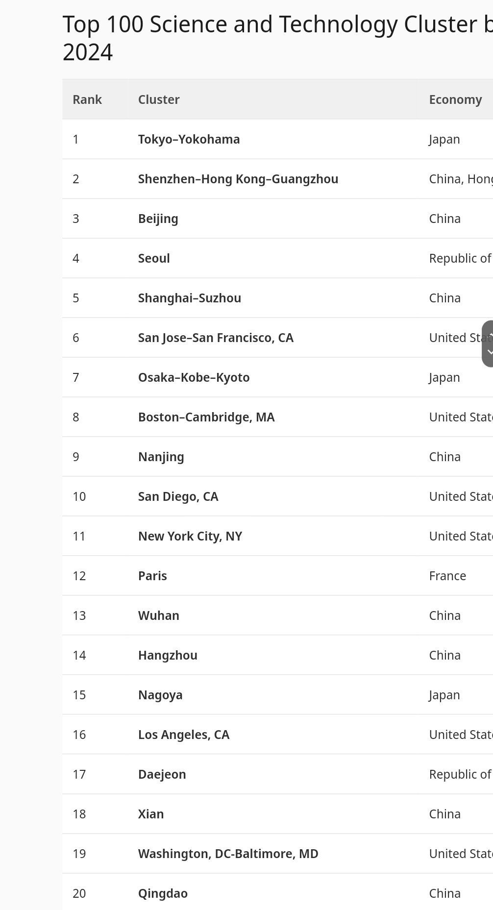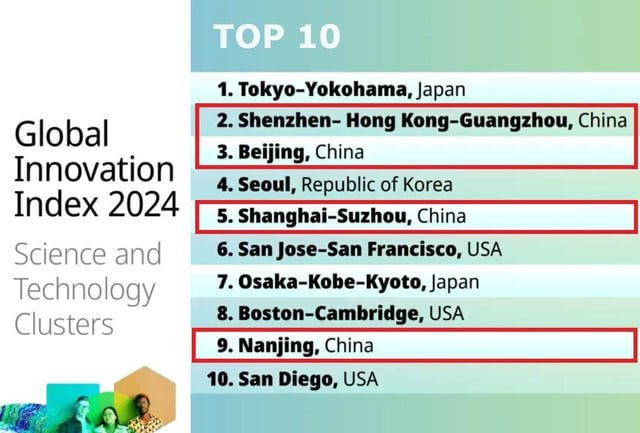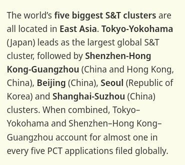 1. 유엔 기구인 WIPO의 2024년 세계 과학 클러스터 순위에 따르면 1위부터 5위까지 전부 한중일등 동아시아 지역으로 서울은 4위를 기록.