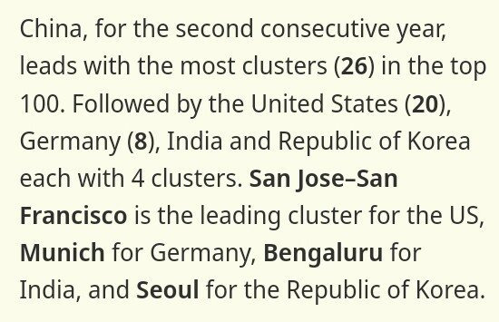 그리고 단순 국가별 클러스터의 갯수로 보면 중국이 26개로 1위, 미국이 20개로 2위, 8개인 독일이 3위, 한국이랑 인도가 공동 4위.