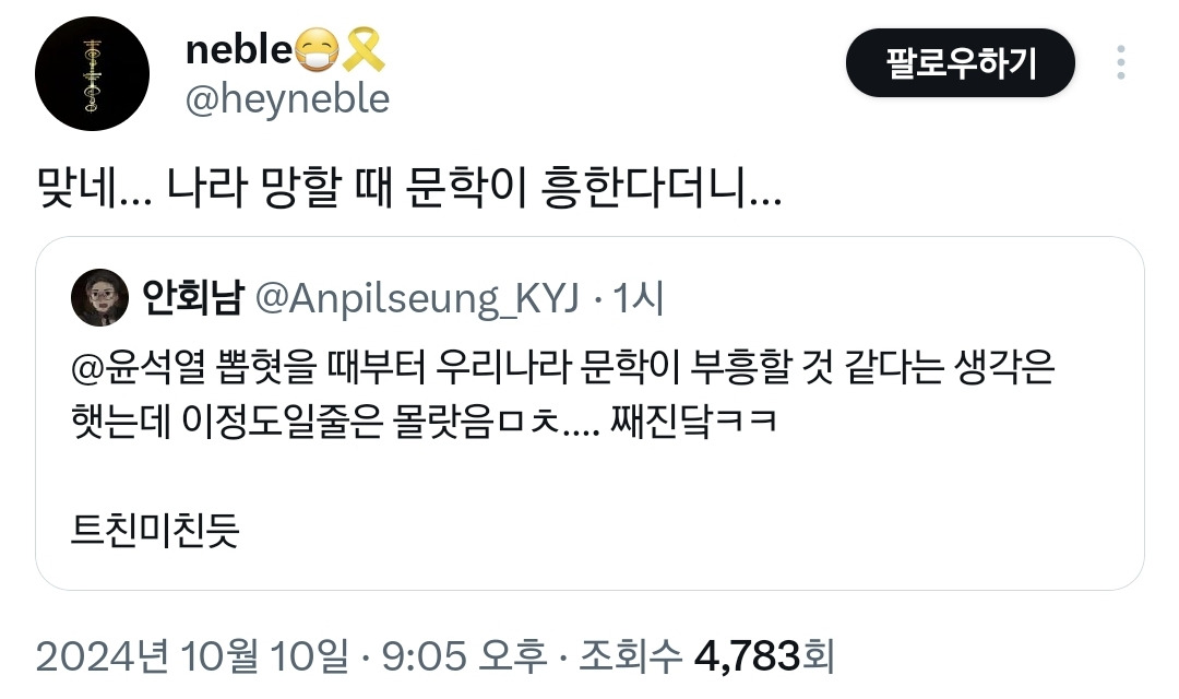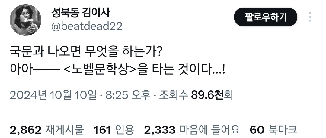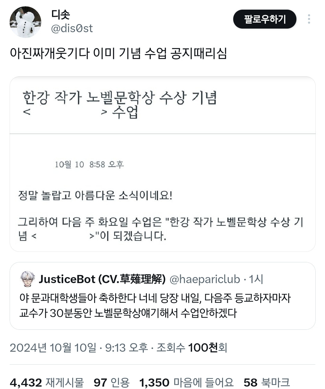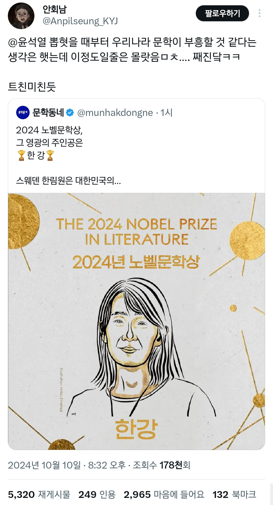 *여성시대* 차분한 20대들의 알흠다운 공간 [흥미돋]이제 문학 무시하지마라 "문송합니다" 금지.twt 작성시간24.10.10|조회수56,376 목록 댓글 130 글자크기 작게가 글자크기 크게가 출처: 여성시대 스피또띠아문과에서 평생 얘기할 역대급 사건 등장 다음검색 현재 게시글 추가 기능 열기 북마크 공유하기 신고 센터로 신고 댓글 130 댓글 리스트 작성시간 24.10.11 문과붐업 작성시간 24.10.11 와 작가님이 여럿 구원하신다ㅠㅠㅋㅋㅋㅋㅋㅋㅋㅋ 작성시간 24.10.11 문과가 나라를 구한다 작성시간 24.10.12 그러네 노벨상 못탔네 이과는 작성시간 24.10.12 문과랑 여자가 탔다고!!!!!!! 카페 방문해 더 많은 댓글 만나기!