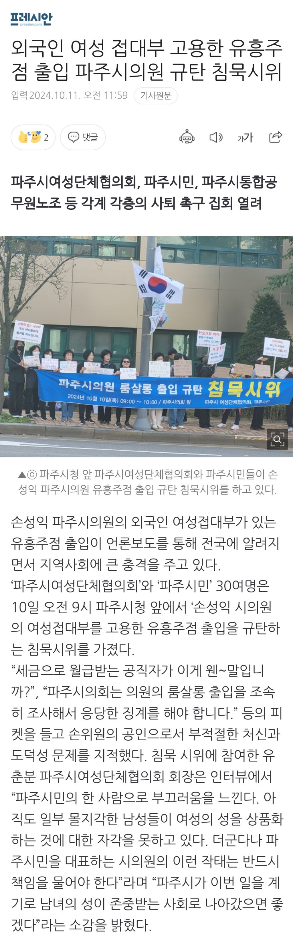 [여시뉴스데스크]외국인 여성 접대부 고용한 유흥주점 출입 파주시의원 규탄 침묵시위 작성자천리길|작성시간24.10.11|조회수823 목록 댓글 1 글자크기 작게가 글자크기 크게가 출처: https://naver.me/xP8l6D02외국인 여성 접대부 고용한 유흥주점 출입 파주시의원 규탄 침묵시위파주시여성단체협의회, 파주시민, 파주시통합공무원노조 등 각계 각층의 사퇴 촉구 집회 열려 손성익 파주시의원의 외국인 여성접대부가 있는 유흥주점 출입이 언론보도를 통해 전국에 알려지n.news.naver.com이하 생략전문 출처로 다음검색 현재 게시글 추가 기능 열기 북마크 공유하기 신고 센터로 신고 댓글 댓글 1 댓글쓰기 답글쓰기 댓글 리스트 작성자개질알하는아부 | 작성시간 24.10.11 몰지각한게 일부가 아니니까 별 상관도 안 하고 지나가는거 아닐까 저새끼 사퇴하려나모르겠네 댓글 전체보기