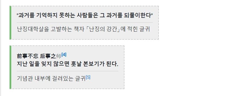 1937년 중일전쟁 당시 일본군이 난징에 진입해 난징 주변과 시내로 도망친 중국군 잔당을 수색한다는 명분으로 6주 동안 중국군 포로들과 난징 시민들을 무참히 학살한 사건. 지금까지도 중일관계에 심대한 악영향을 끼치는 사건 중 하나로[6] 학살의 정확한 규모는 불명확하지만 전후 일부 유골 매립지를 근거로 든 연구결과가 수만명 단위 이하로 내려가는 경우는 드문 것으로 볼 때 최소 수만 명 이상이 희생당한 것으로 추정된다. 극동국제재판 판결에 따르면 최소가 12만명[7]이며 최대 추정 숫자는 약 35만명 정도다.