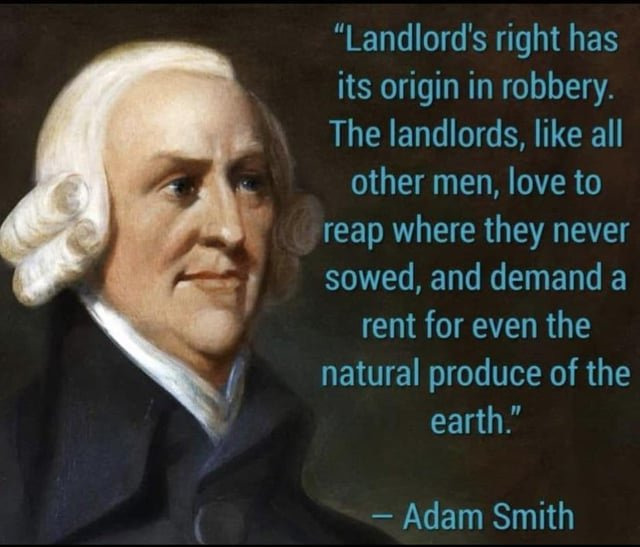 [ 애덤 스미스 : 지주의 권리는 강도의 그것과 같다. 그들은 경작하지 않은것을 가져가고 자연에서 나는것조차 가져간다. ]