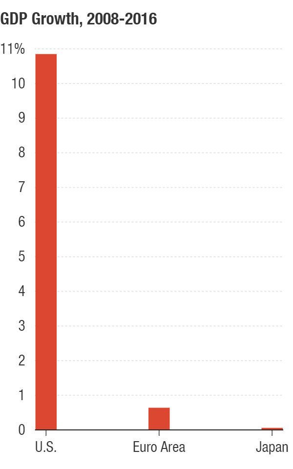 [ 2008 - 2016 년 미국, 유로존, 일본 성장률 ]
