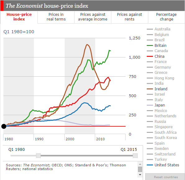 [ 디플레를 겪은 일본을 제외하고 1990년대 이후 4배 이상 폭증한 선진국 부동산 가격 ]