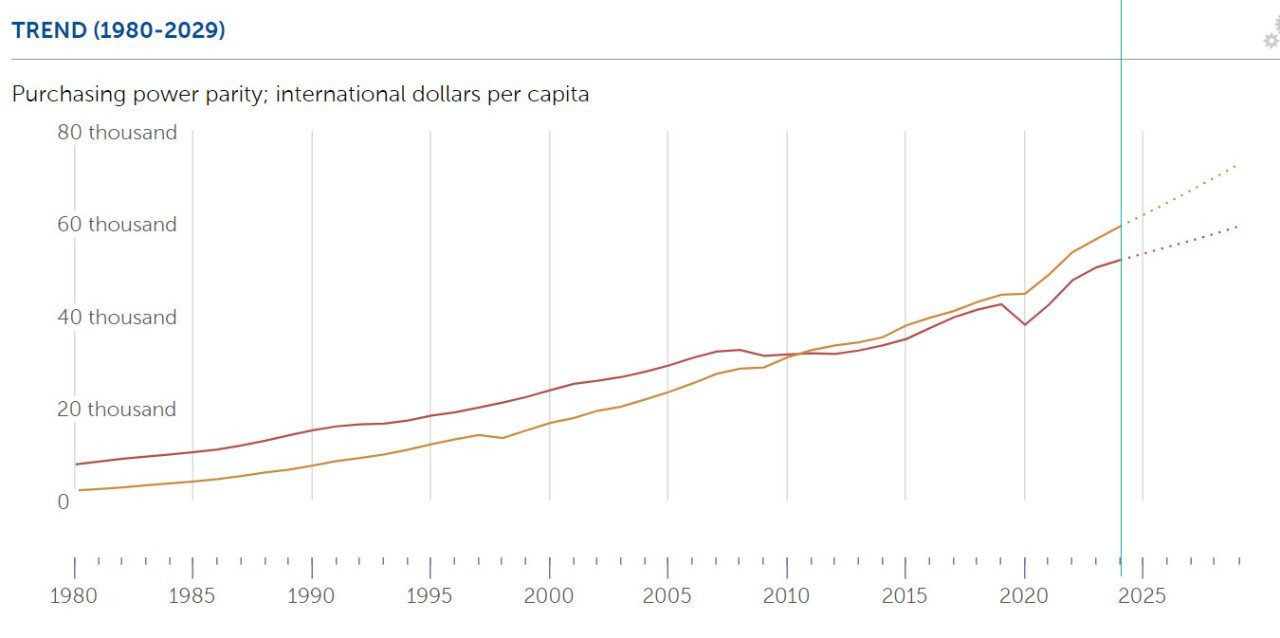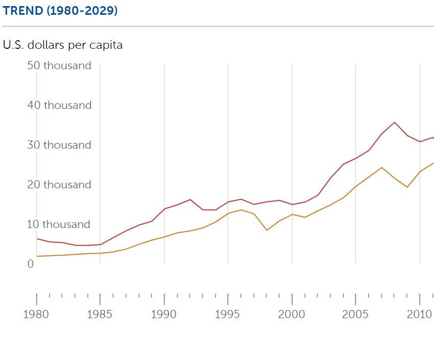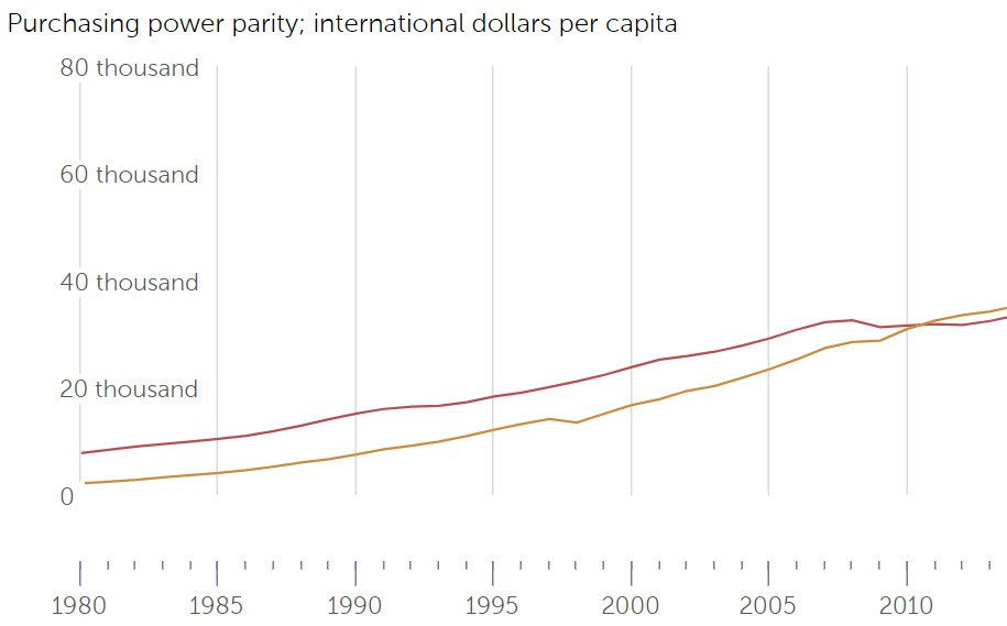 구매력 기준 소득은 이미 양국이 거의 비슷해진 상황이었어