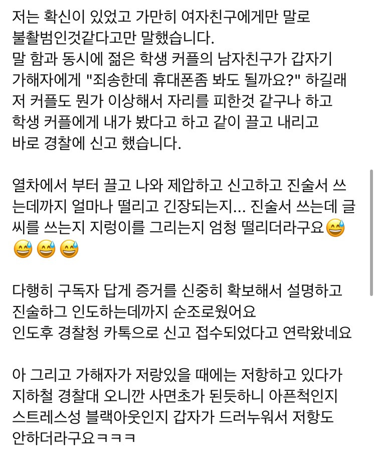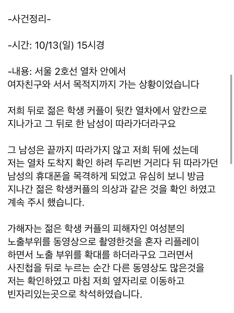 최근 한달 사이 이런 제보가 세 건이나 들어왔다는 사실이 놀랍고 슬프면서도 이렇게 용기 내서 범인 검거해주는 사람도 있다는 점에서 다시 인류애를 되찾게 되더라구.