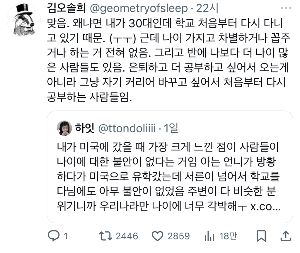 작성자도라도라방방 작성시간 24.10.20 나는 근데 미국 아예 나이 상관 안하는지는 잘 모르겠던데..! 인터뷰에서 나이 질문하고 졸업이 늦는단 식으로 얘기들은 친구 있었음 인터뷰어가 어느 문화권 사람이엇는진 모르겠지만.. 근데 다만 해외에서 넘어오는 경우가 정말 많고 이경우 매력적인 스펙으로 낮은 자리 지원하는 경우 있고 이럴때 한국처럼동료생각하기보단 회사입장으로 뽑는것같아