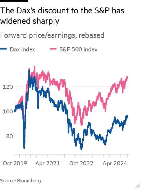 그래서 독일 주식은 미국 S&P 500보다 예전엔 20% 싸게 팔렸다면 지금은 무려 40% 싸게 팔리고 있음.