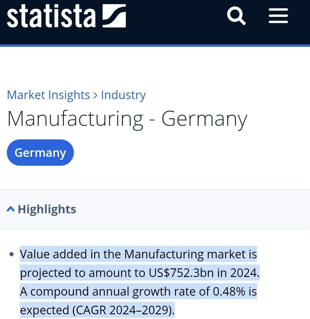 게다가 독일 기업들은 성장률이 낮기로 유명함. 왜냐면 독일 주력 기업들 다수는 여전히 자동차산업과 같은 전통 제조업 위주기 때문.