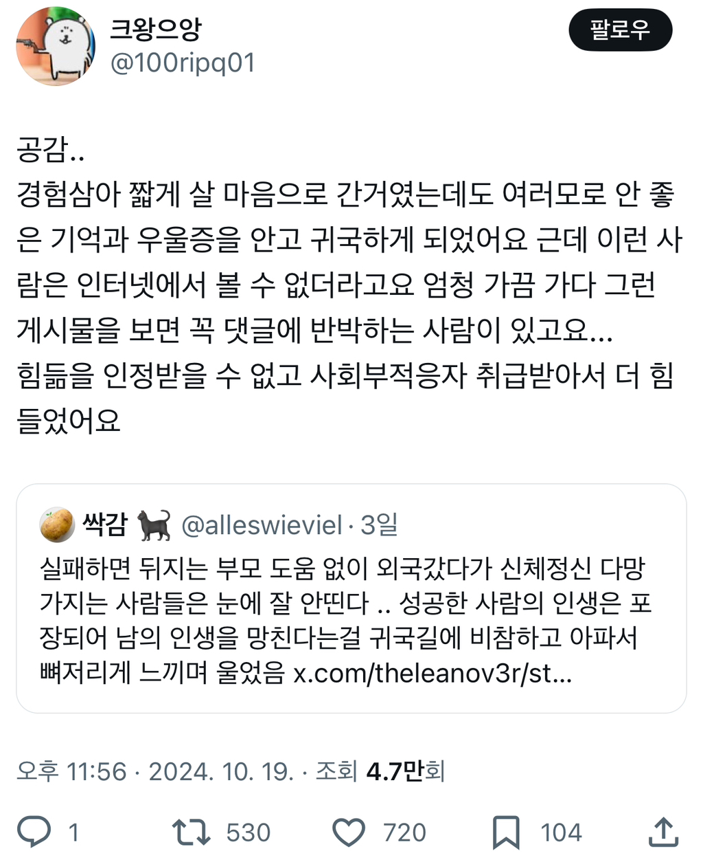 [스크랩] [기타]실패하면 뒤지는 부모 도움 없이 외국갔다가 신체정신 다망가지는 사람들은 눈에 잘 안띤다 ..twt
