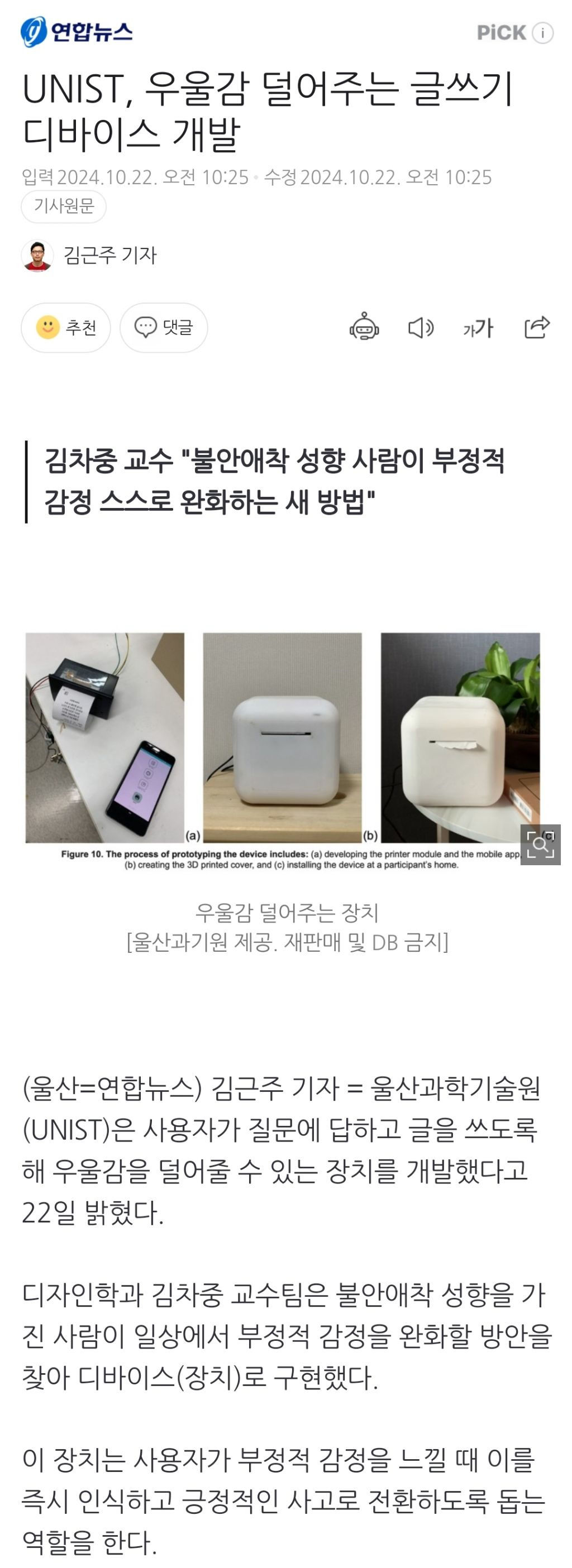 [여시뉴스데스크]UNIST, 우울감 덜어주는 글쓰기 디바이스 개발 작성자천리길|작성시간24.10.22|조회수11,633 목록 댓글 10 글자크기 작게가 글자크기 크게가 출처: https://naver.me/xnhqs0gpUNIST, 우울감 덜어주는 글쓰기 디바이스 개발김차중 교수 "불안애착 성향 사람이 부정적 감정 스스로 완화하는 새 방법" 울산과학기술원(UNIST)은 사용자가 질문에 답하고 글을 쓰도록 해 우울감을 덜어줄 수 있는 장치를 개발했다고 22일 밝n.news.naver.com이하 생략전문 출처로 다음검색 현재 게시글 추가 기능 열기 북마크 공유하기 신고 센터로 신고 댓글 댓글 10 댓글쓰기 답글쓰기 댓글 리스트 작성자온고지신 | 작성시간 24.10.22 저요 저요 작성자콘샐러드맛있다 | 작성시간 24.10.22 오갖고싶어 작성자Epllldsssldl | 작성시간 24.10.22 궁금하다 작성자독일돌고래 | 작성시간 24.10.22 살려줘 작성자쾌유 | 작성시간 24.10.23 필요해 댓글 전체보기