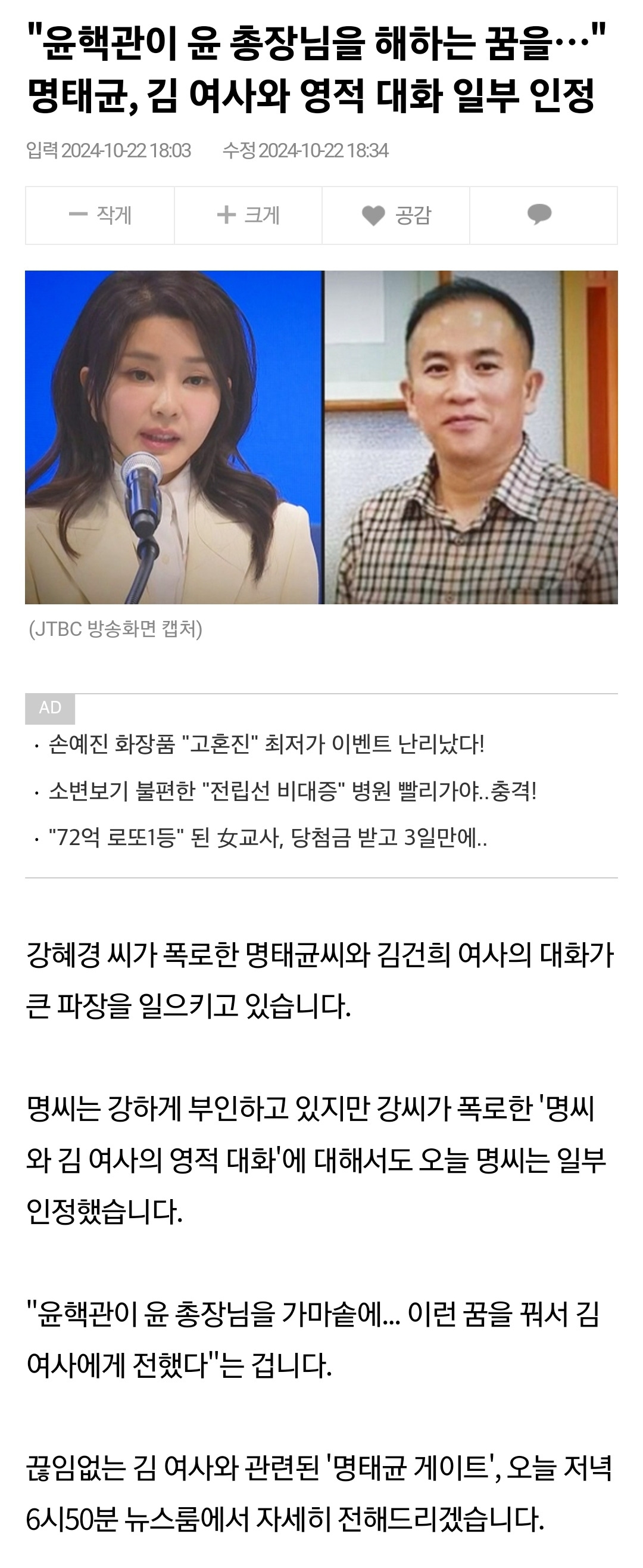 [여시뉴스데스크]"윤핵관이 윤 총장님을 해하는 꿈을…" 명태균, 김 여사와 영적 대화 일부 인정 작성자나한상|작성시간24.10.22|조회수605 목록 댓글 2 글자크기 작게가 글자크기 크게가 출처: https://mnews.jtbc.co.kr/News/Article.aspx?news_id=NB12220020"윤핵관이 윤 총장님을 해하는 꿈을…" 명태균, 김 여사와 영적 대화 일부 인정(JTBC 방송화면 캡처)강혜경 씨가 폭로한 명태균씨와 김건희 여사의 대화가 큰 파장을 일으키고 있습니다.명씨는 강하게 부인하고 ..mnews.jtbc.co.kr 다음검색 현재 게시글 추가 기능 열기 북마크 공유하기 신고 센터로 신고 댓글 댓글 2 댓글쓰기 답글쓰기 댓글 리스트 작성자괴도맛쿠키 | 작성시간 24.10.22 이번정부 대체 어디까지 가는거지 작성자lily_black | 작성시간 24.10.22 영적..대화요? 댓글 전체보기