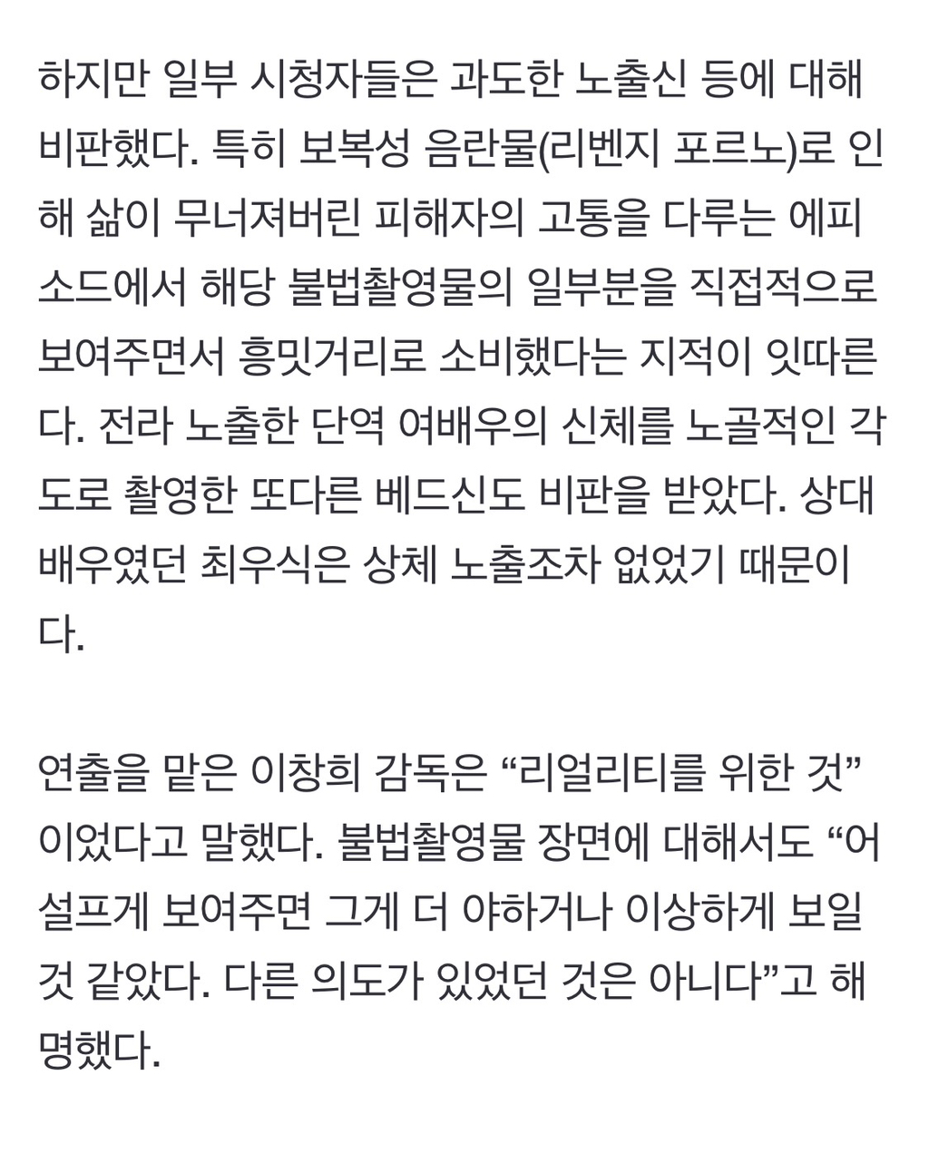 [스크랩] [여시뉴스데스크]“흥미로 소비된 노출신?”…‘살인자ㅇ난감’ 호평과 논란 사이 작성자천리길|작성시간24.10.22|조회수4,928 목록 댓글 4 글자크기 작게가 글자크기 크게가 출처 : https://naver.me/xc9agF3s전문 출처 다음검색 스크랩 원문 : *여성시대* 차분한 20대들의 알흠다운 공간 현재 게시글 추가 기능 열기 북마크 공유하기 신고 센터로 신고 댓글 댓글 4 댓글쓰기 답글쓰기 댓글 리스트 작성자롤모델루피 | 작성시간 24.10.22 난 저 드라마 전체적으로 별로 였음 거기 나오는 프로파일러 여성도 이상하게 표현함 막 거울보고 그런거 작성자례전부터 | 작성시간 24.10.22 최우식은 심지어 상의도 입은채로 나오는데 여자만 전부 벗고있음 작성자MICKEY 18 | 작성시간 24.10.22 리얼리티를 위한 것..ㅈㄹㅋㅋ 왜 손석구 아역은 딥페이크 합성하셨는지ㅋㅋ 작성자ISFP를 회사에서 석방하라석방하라 | 작성시간 24.10.23 누가봐도여자만벗겨놨어요. 조금보다가말음 댓글 전체보기