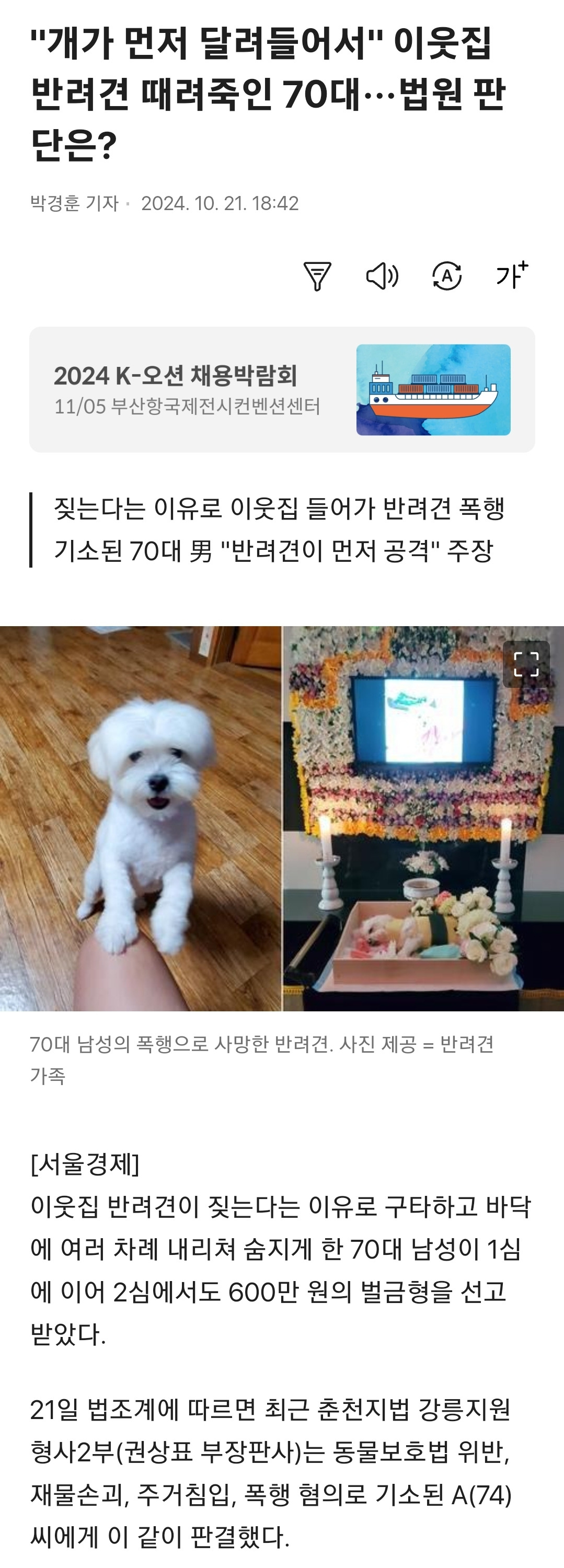 [여시뉴스데스크]"개가 먼저 달려들어서" 이웃집 반려견 때려죽인 70대···법원 판단은? 작성자나한상|작성시간24.10.22|조회수1,686 목록 댓글 14 글자크기 작게가 글자크기 크게가 출처: https://v.daum.net/v/20241021184248116"개가 먼저 달려들어서" 이웃집 반려견 때려죽인 70대···법원 판단은?[서울경제] 이웃집 반려견이 짖는다는 이유로 구타하고 바닥에 여러 차례 내리쳐 숨지게 한 70대 남성이 1심에 이어 2심에서도 600만 원의 벌금형을 선고 받았다. 21일 법조계에 따르면 최근 춘천v.daum.net 다음검색 현재 게시글 추가 기능 열기 북마크 공유하기 신고 센터로 신고 댓글 댓글 14 댓글쓰기 답글쓰기 댓글 리스트 작성자왈왈이와냥냥이 | 작성시간 24.10.22 미쳤나 남의 집에 왜 들어가냐 작성자바바라가 | 작성시간 24.10.22 우리 강아지였음 갈배 똑같이죽이고 청주감ㅅㅂ 작성자블랙버블티 | 작성시간 24.10.22 쟤가 무슨 죄야 할배새끼 뒤져라 작성자일찍자자제발요 | 작성시간 24.10.23 저새끼 집에 처들어가서 죽이고 벌금 600낼게 ㅅㅂ 작성자푸른초원속삶 | 작성시간 24.10.23 벌금 받고 민사소송도 받아서 돈이라도 처벌받았으면 좋겠다 나같으면 진짜 때려죽이고 싶지만 댓글 전체보기