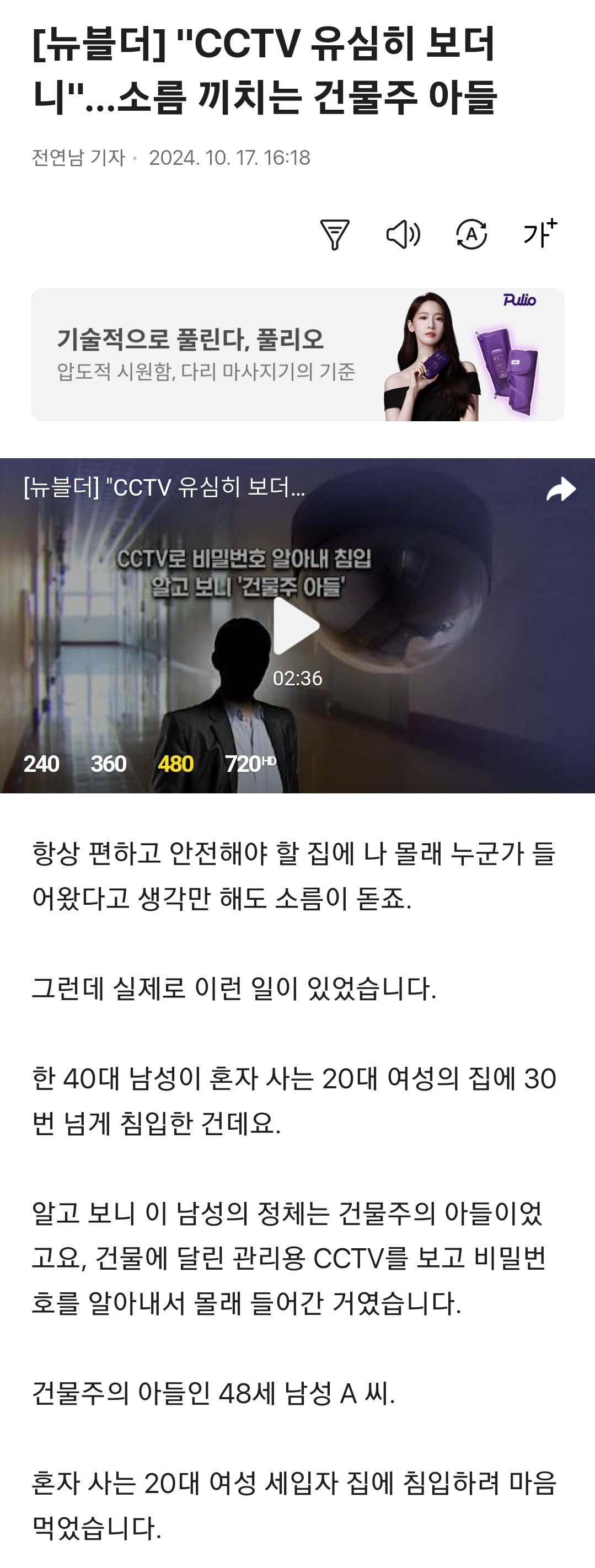 [여시뉴스데스크][뉴블더] "CCTV 유심히 보더니"…소름 끼치는 건물주 아들 작성자나한상|작성시간24.10.22|조회수3,739 목록 댓글 3 글자크기 작게가 글자크기 크게가 출처: https://v.daum.net/v/20241017161810972[뉴블더] "CCTV 유심히 보더니"…소름 끼치는 건물주 아들항상 편하고 안전해야 할 집에 나 몰래 누군가 들어왔다고 생각만 해도 소름이 돋죠. 그런데 실제로 이런 일이 있었습니다. 한 40대 남성이 혼자 사는 20대 여성의 집에 30번 넘게 침입한 건데요. v.daum.net 다음검색 현재 게시글 추가 기능 열기 북마크 공유하기 신고 센터로 신고 댓글 댓글 3 댓글쓰기 답글쓰기 댓글 리스트 작성자즐길 수 없으면 피해라 | 작성시간 24.10.22 아니 진심으로 한남들 유전자 개조 해야되는거 아님? 존나 음침해 작성자더웠다추웠다더웠다 | 작성시간 24.10.22 역시 남자~~~ 작성자여수아침바다 | 작성시간 24.10.22 걍 뒤졌으면 댓글 전체보기