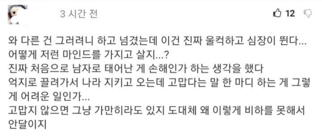 작성자허참나 작성시간 24.10.28 에어팟 들으면서 뷔페식 쳐먹고 틱톡 라방까지 켜더만^^ 니네 군캉스 즐기는 동안 뼈 빠지게 일하며 세금 내는 여자들한테 오히려 감사하진 못할망정 누가 누구한테 감사? ㅋㅋㅋㅋㅋ
