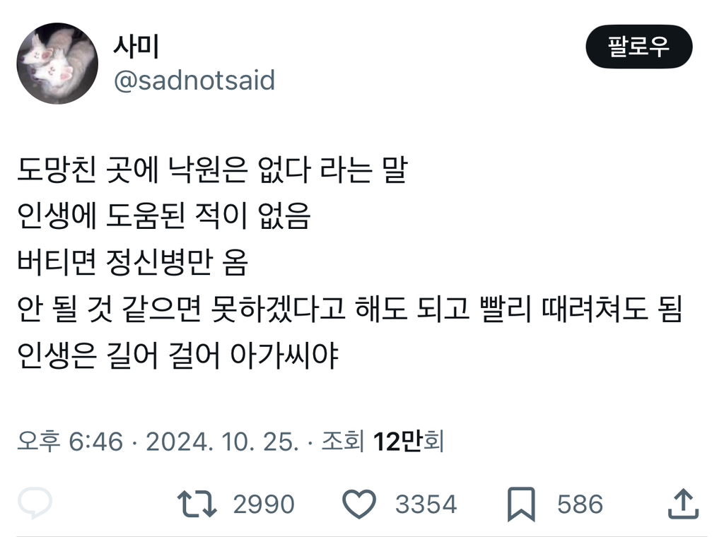작성자끄아아아아아아아아악 작성시간 24.10.26 지옥을 버텨보니 낙원일 수도 있고