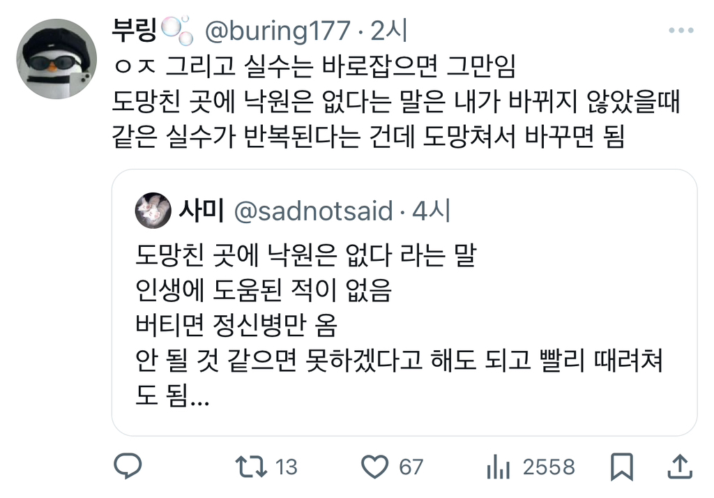 작성자앵재기뤼~ 작성시간 24.10.26 결과론적이긴한데 결국 자신의 선택에 후회를 갖지않는 사람이 말의 의미를 다르게 받아들일 수 있는거라고 생각해