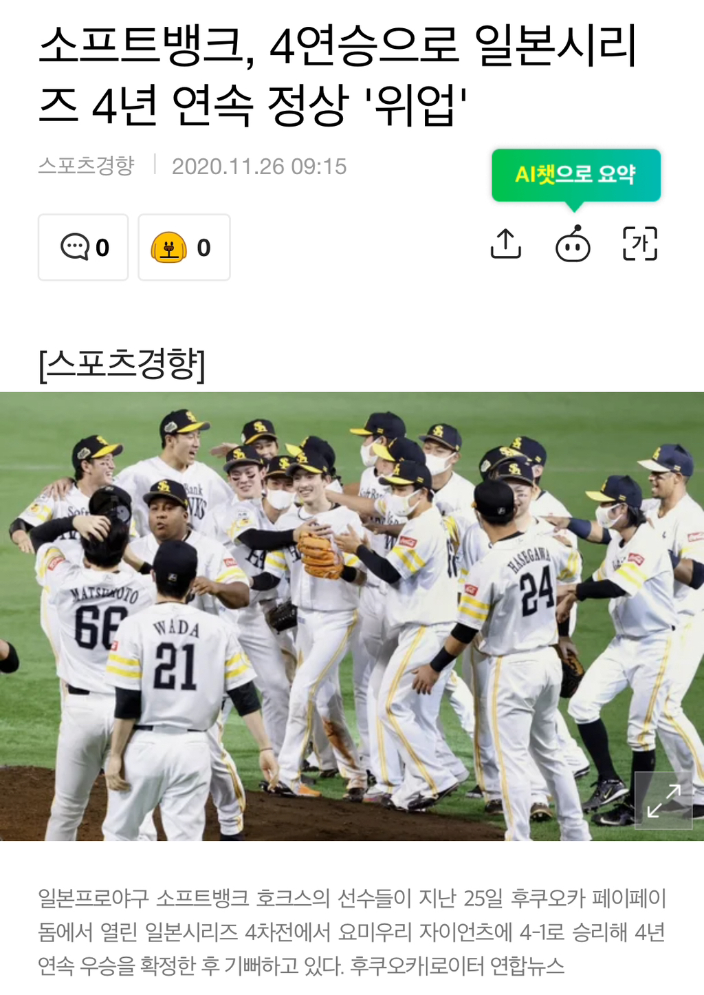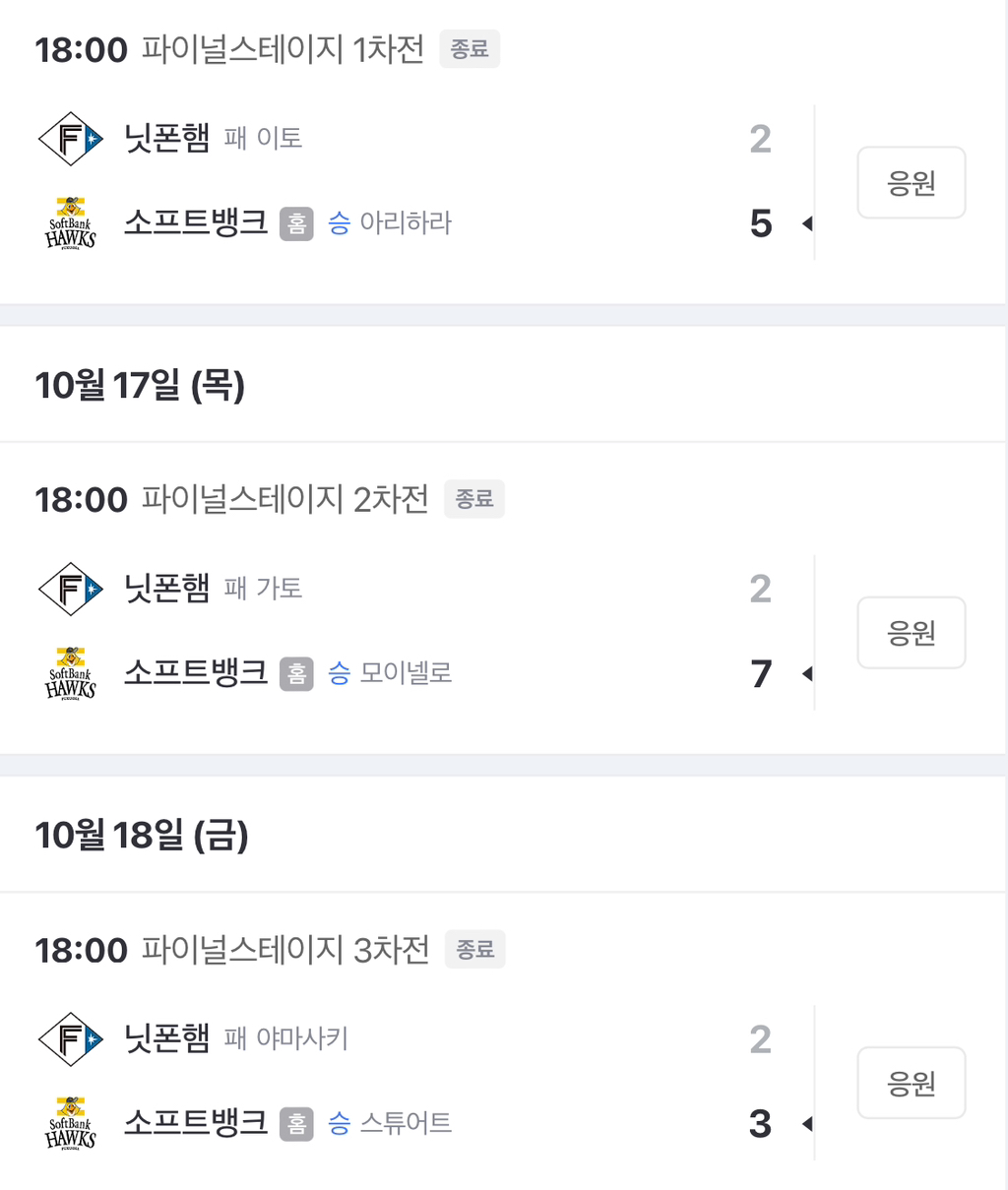 소프트뱅크는 앞서 말했듯이 워낙 강해서... 정규시즌 최고 승률 팀답게 3연승으로 가볍게 끝냄