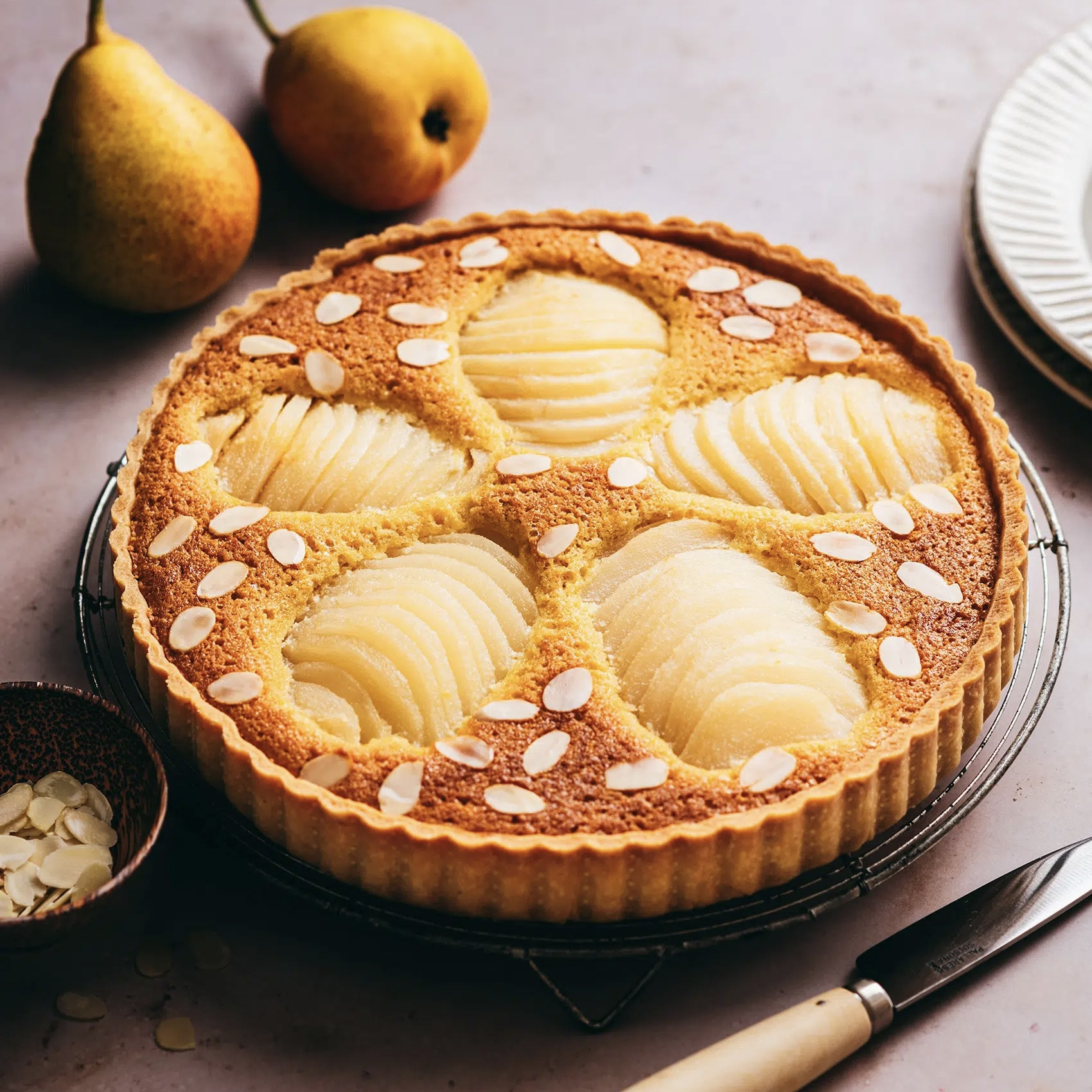 타르트지 위에 아몬드 크림을 깔고, 그 위에 설탕에 절인 배를 얇게 썰어서 통째로 올린 후, 사이사이에 저민 아몬드를 올려서 만들어. 독특하게도 이 아몬드 크림은 아몬드 가루, 설탕, 버터, 달걀, 럼주를 섞어 오븐에 구워서 만들기 때문에 흘러내리는 질감이 아닌, 꽤 단단한 모양을 갖춘게 특징이야.