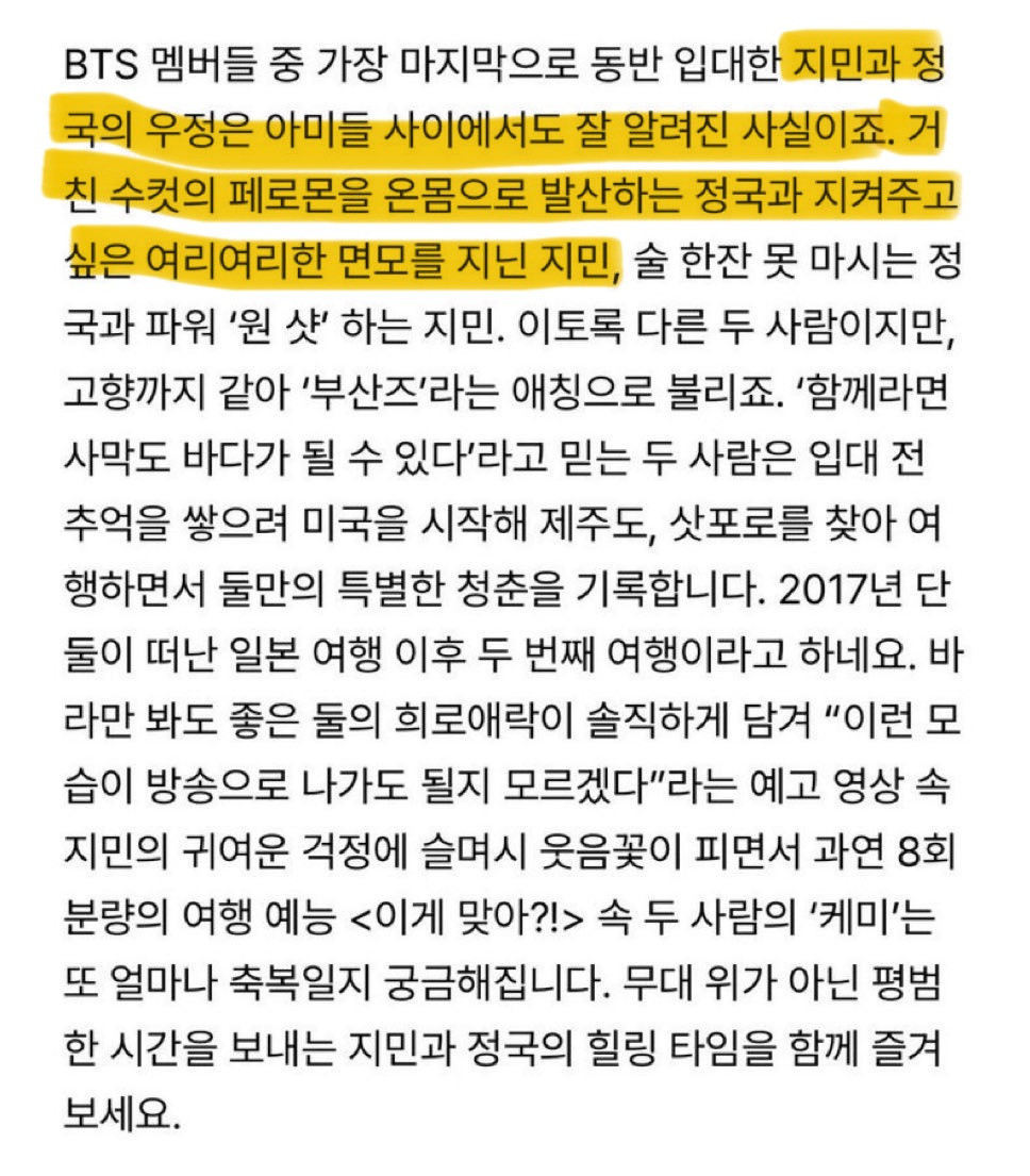 얘네 호모에 미쳤나봐 ㅋㅋㅋㅋ 둘이 같이 간 자컨 소개를 이렇게 해둠 ㅋㅋㅋㅋㅋㅋㅋ 수컷의 페로몬과 지켜주고 싶은 여리여리한 와우....... 지민 얼굴을 보고도 저런 생각이 들 수가 있어?