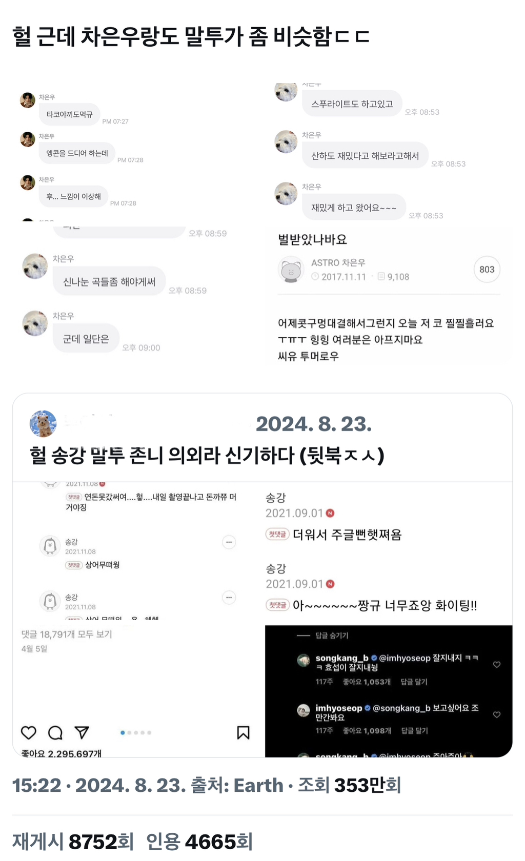 작성자옥스스 작성시간 24.10.28 못생기고 작은 남들이 여자 이겨먹고 가스라이팅 할라고 말투 틱틱대고 ㅆㄱㅈ 없게 자존감 뭉게는 말투 씀 태초부터 키크고 잘생긴 애들은 굳이 남자다움이고 뭐고 증명할 필요도 없고 열등감 없어서 애교섞인 말투 자연스럽게 쓰는듯 송강은 소속사에서 관리하는지 요즘은 저 말투 안 쓴다매 차은우는 지켜야한다