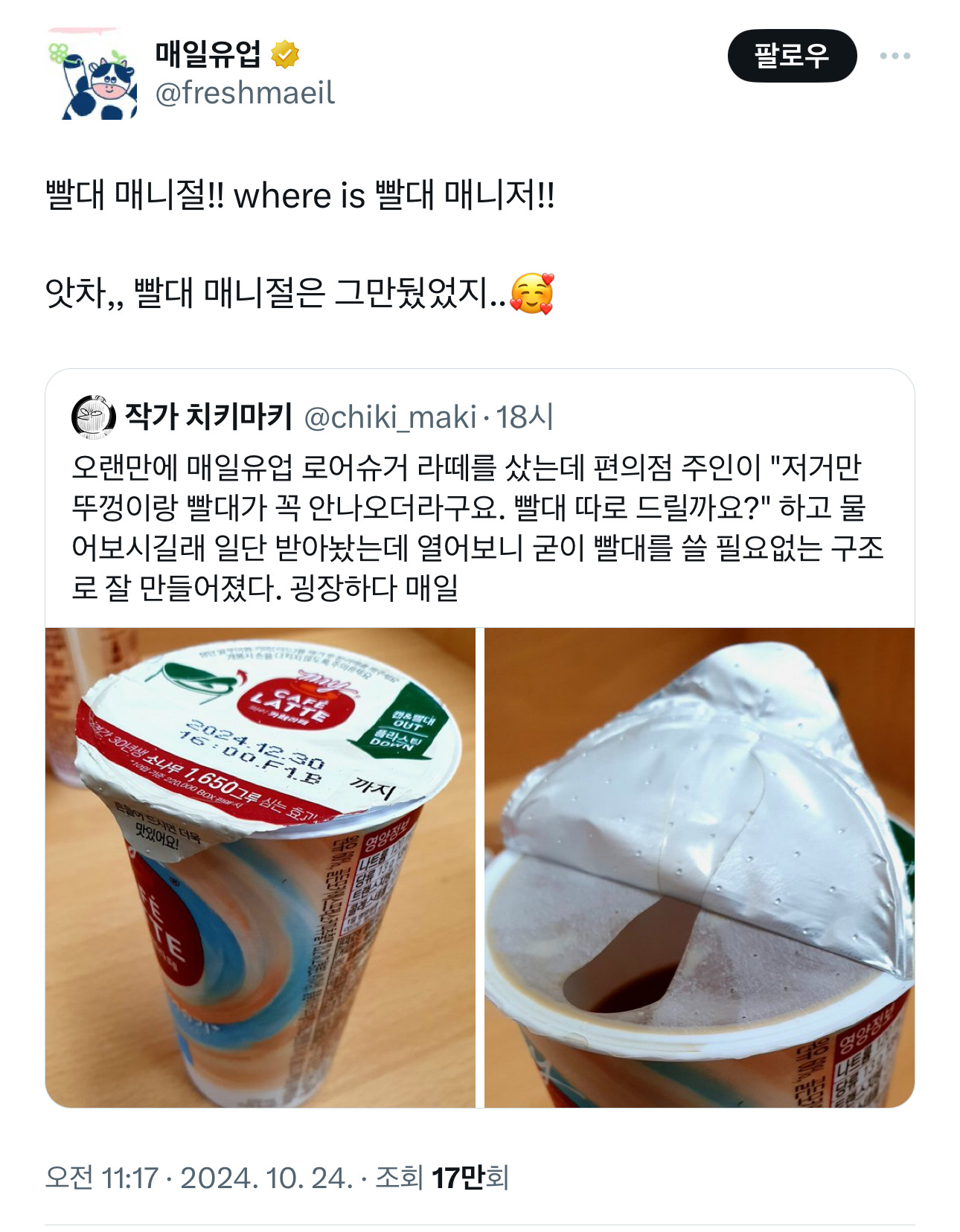 [스크랩] [흥미돋]빨대 매니절!! where is 빨대 매니저!! 작성자dtdewf|작성시간24.10.29|조회수11,572 목록 댓글 29 글자크기 작게가 글자크기 크게가 출처: 여성시대 나프탈렌향https://x.com/freshmaeil/status/1849274009164431676?s=46&t=v7QMmEln8v7WsADFKYn65gX의 매일유업님(@freshmaeil)빨대 매니절!! where is 빨대 매니저!! 앗차,, 빨대 매니절은 그만뒀었지..🥰x.com 다음검색 스크랩 원문 : *여성시대* 차분한 20대들의 알흠다운 공간 현재 게시글 추가 기능 열기 북마크 공유하기 신고 센터로 신고 댓글 댓글 29 댓글쓰기 답글쓰기 댓글 리스트 작성자모든게 티피컬 | 작성시간 24.10.29 좋다 작성자시그널시즌투얼른나와 | 작성시간 24.10.29 환경 친화 매일유업 좋아 작성자아우룸 | 작성시간 24.10.29 와? 대박! 진짜 잘만들었다 심지어 저당? 작성자걸음 | 작성시간 24.10.29 나 저 제품 좋아해 맛도있고 마시기 편하고 작성자고준혁한 저녁 | 작성시간 24.10.29 트위터 진짜 귀엽다 ㅠ 다른 거 먹을 바엔 저거 사먹어야지! 댓글 전체보기
