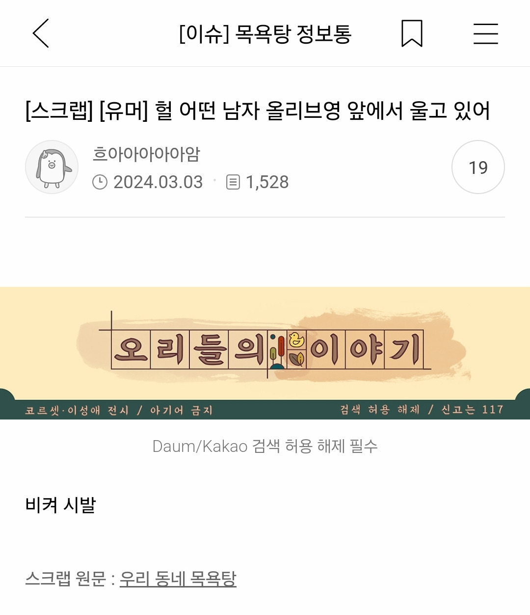 [배꼽의행방]헐 어떤 남자 올리브영 앞에서 울고 있어 작성자dtdewf|작성시간24.10.29|조회수5,885 목록 댓글 13 글자크기 작게가 글자크기 크게가 출처: https://m.cafe.daum.net/weareshower/ZEmx/429102모든 이야기의 시작 - Daum 카페모든 이야기의 시작, Daum 카페m.cafe.daum.net 다음검색 현재 게시글 추가 기능 열기 북마크 공유하기 신고 센터로 신고 댓글 댓글 13 댓글쓰기 답글쓰기 댓글 리스트 작성자떡볶이가제일조아 | 작성시간 24.10.29 비켜시발 하면서 들어옴 작성자네쿠카라하츄핑 | 작성시간 24.10.29 봐도봐도 명문 작성자짱워녕 | 작성시간 24.10.29 이건 진짜 볼때마다 명문이라 들어온다죠 작성자2024 기아우승 | 작성시간 24.10.29 아 진짜 언제 안웃길까ㅠㅠㅋㅋㅋㅋㅋㅋㅋㅋㅋ내최애글 작성자mickeymouse | 작성시간 24.10.29 비켜 시반 각인수준 댓글 전체보기