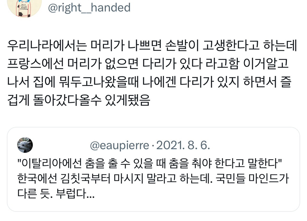 [흥미돋]우리나라에서는 머리가 나쁘면 손발이 고생한다고 하는데 작성자my sandwich|작성시간24.10.29|조회수2,565 목록 댓글 10 글자크기 작게가 글자크기 크게가 출처: https://x.com/right__handed/status/1423554239238914055?s=46&t=RpmwtRdi1Jrsye6BY1_c7Aㅁㅂ 다음검색 현재 게시글 추가 기능 열기 북마크 공유하기 신고 센터로 신고 댓글 댓글 10 댓글쓰기 답글쓰기 댓글 리스트 작성자휘바훔바 | 작성시간 24.10.29 휴 머리가 고생할뻔했어 몸을 써야디 작성자면세 | 작성시간 24.10.29 원트에 있는 춤을 출 수 있을 때 춤을 춰야한다는 말 너무 좋다 작성자종국이 두마리 치킨 | 작성시간 24.10.29 ㄹㅇ 머리가 나쁘면 몸이 고생하는게 아니고 몸을 쓰면 머리 아프게 머리를 안 써도 되는데 왜?? 작성자platina. | 작성시간 24.10.29 귀엽고 긍정적이야 작성자cherrycoke | 작성시간 24.10.29 손발이 나쁘면 머리가 고생하는거라고~ 댓글 전체보기