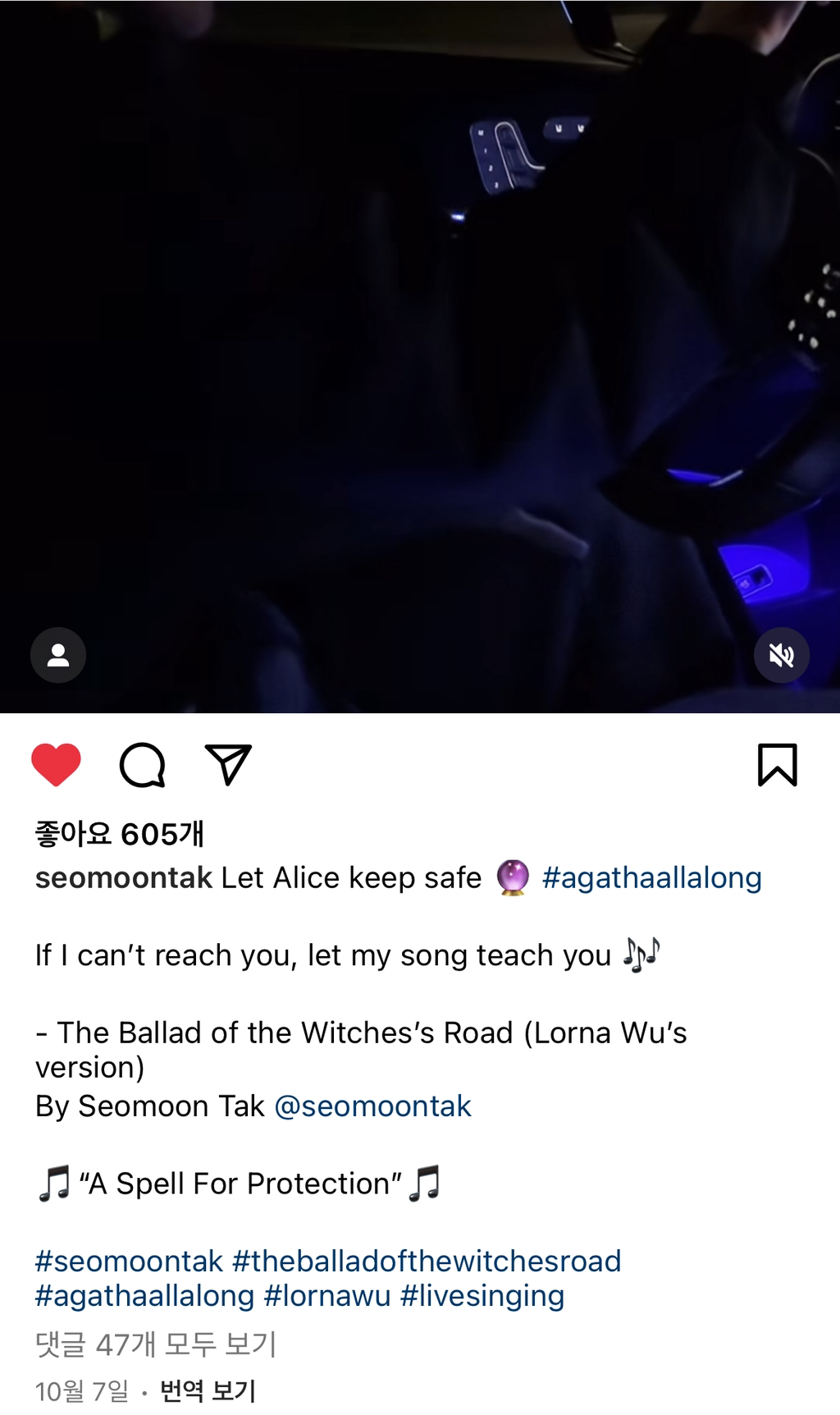 서문탁이 인스타에 차에서 witches’ road 부르는 영상 올리셨는데 같이 써놓은 글이.. 로나 우가 노래 만든 목적 상기시켜서 눈물 자극 🥹