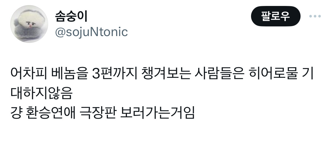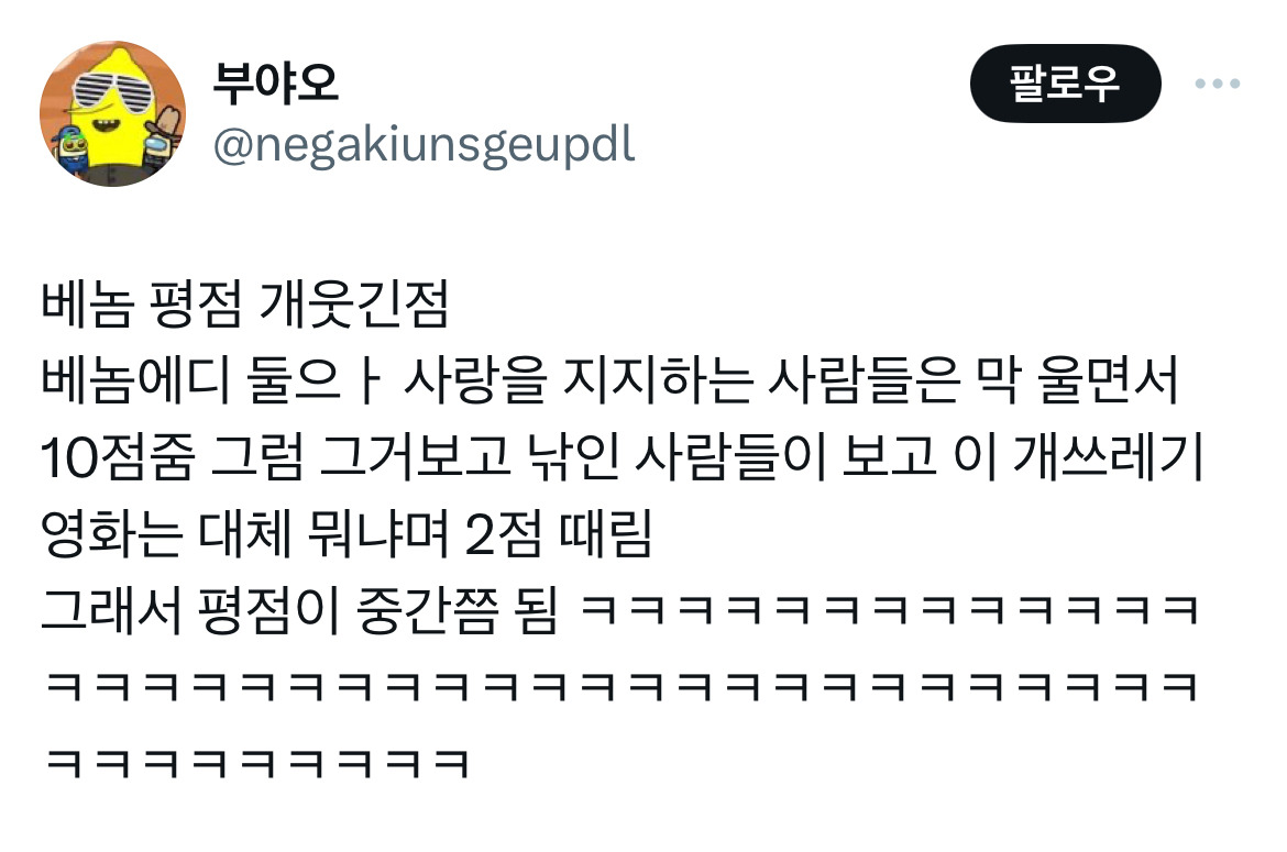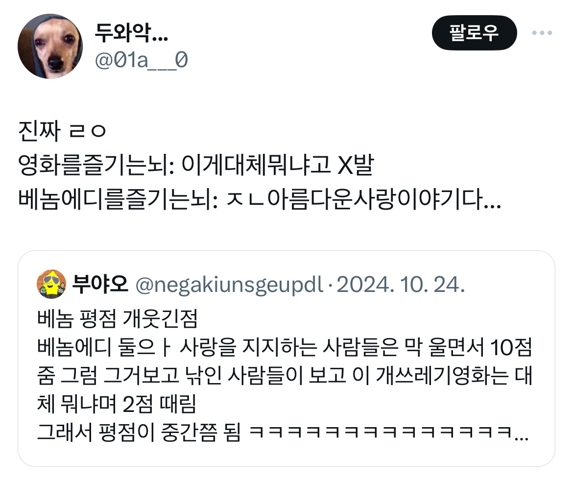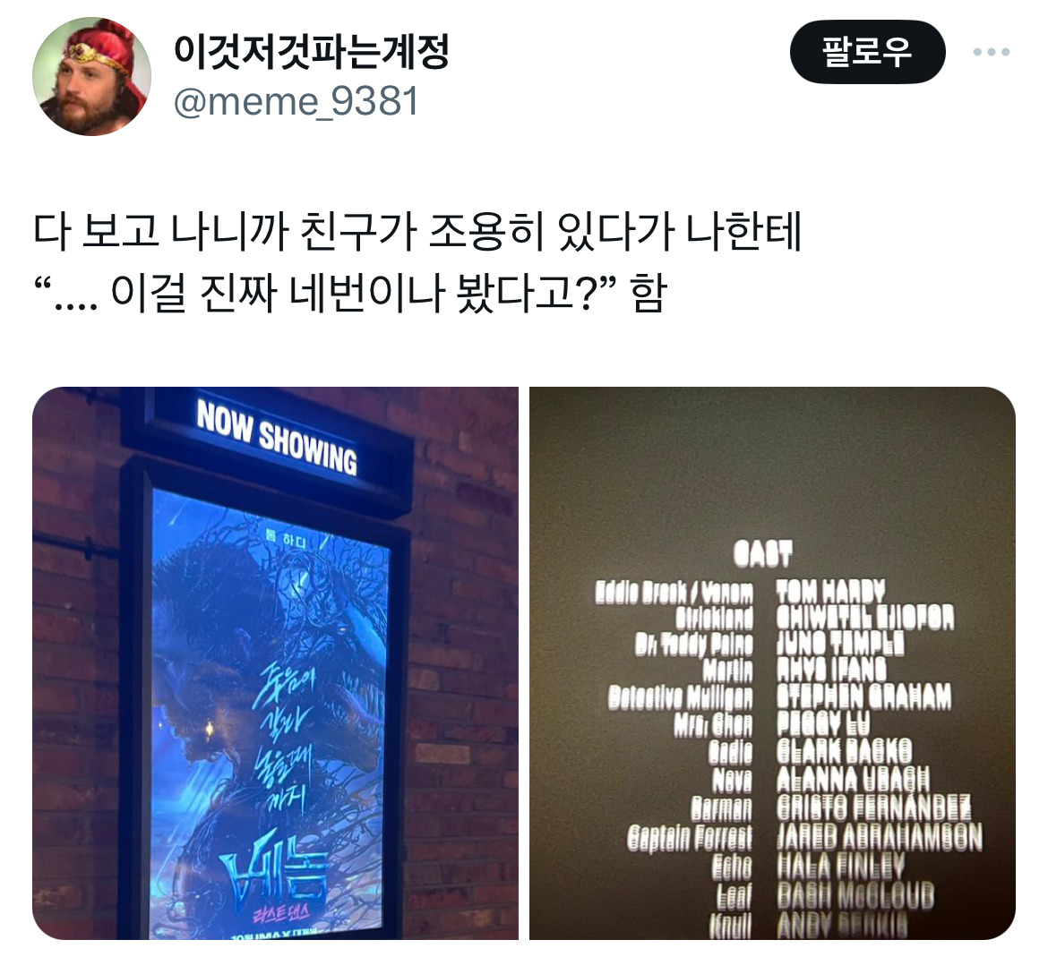 [흥미돋]베놈 평점 개웃긴점.twt 작성자RKID|작성시간24.11.01|조회수18,007 목록 댓글 96 글자크기 작게가 글자크기 크게가 출처: https://x.com/negakiunsgeupdl/status/1849260813300957418?s=46&t=Ubli_gnZh_-8ygJj650pCg 나같은 경우 10점을 줌 다음검색 현재 게시글 추가 기능 열기 북마크 공유하기 신고 센터로 신고 댓글 댓글 96 댓글쓰기 답글쓰기 댓글 리스트 작성자최영도 | 작성시간 24.11.02 ㅋㅌㅌㅌㅋㅋㅋㅋㅋㅋㅋㅋ 작성자톰과제ㄹl | 작성시간 24.11.02 10점💛 작성자석열찮네명신새끼 | 작성시간 24.11.02 빨리 봐야겠닼ㅋㅋㅋㅋㅋㅋ 작성자내개로와 | 작성시간 24.11.02 만점 작성자빠라라라빠 | 작성시간 24.11.03 이게 나한텐 노트북이고 라라랜드임 댓글 전체보기