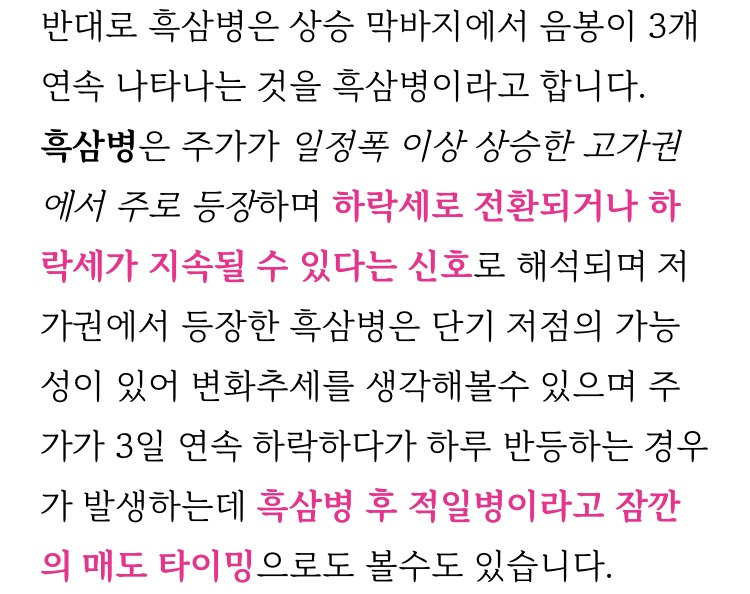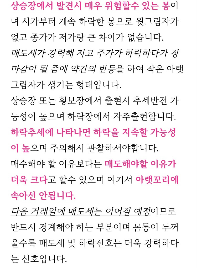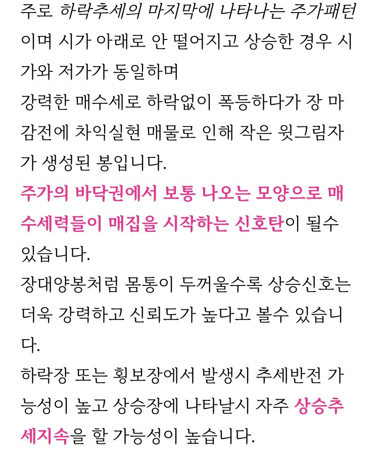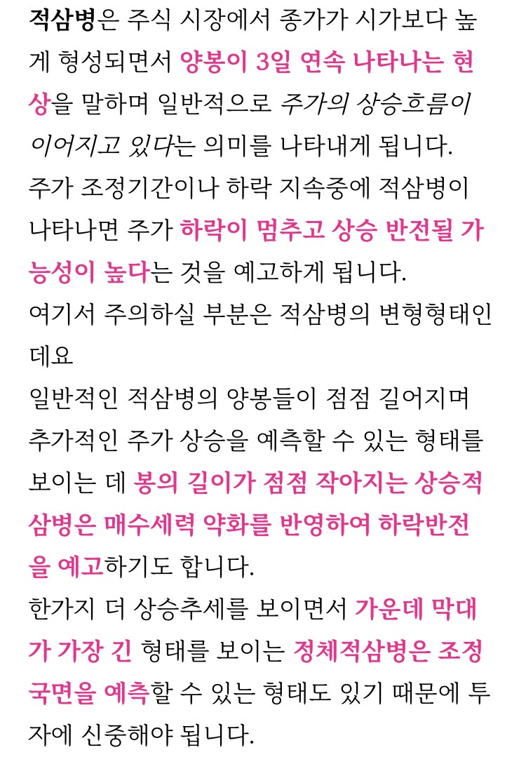 [흥미돋]주식 차트 보는 방법 - 봉 차트 패턴 (샅바형, 적삼병, 흑삼병) 작성자광신도|작성시간24.11.02|조회수3,253 목록 댓글 4 글자크기 작게가 글자크기 크게가 출처: 네이버 블로그 https://m.blog.naver.com/popo777oo/222854408638?referrerCode=1주식 차트 보는 방법 - 봉 차트 패턴 (샅바형, 적삼병, 흑삼병)주식 차트 보는 방법 - 봉 차트 패턴 (상승샅바형, 하락샅바형, 적삼병, 정체적삼병, 상승적삼병, 흑삼병, ...blog.naver.com 다음검색 현재 게시글 추가 기능 열기 북마크 공유하기 신고 센터로 신고 댓글 댓글 4 댓글쓰기 답글쓰기 댓글 리스트 작성자주토피아 | 작성시간 24.11.02 오 궁금했는데 고마워 작성자괴도맛쿠키 | 작성시간 24.11.02 이런거 진짜 외우고싶었는데 고마워 북마크 작성자우영우영우 | 작성시간 24.11.02 내용이 좀 잘못된 거 같은데 시가=저가(장 시작 후 내려가지 않고 계속 상승만함) 인데 어떻게 봉이 파래 답댓글 작성자광신도 작성자 본인 여부 작성자 | 작성시간 24.11.02 상승 샅바형 예시 그림 말한거지? 나도 여시 댓 보고 다시 보니 이상해서 다른 걸로 교체했어~~ 댓글 전체보기