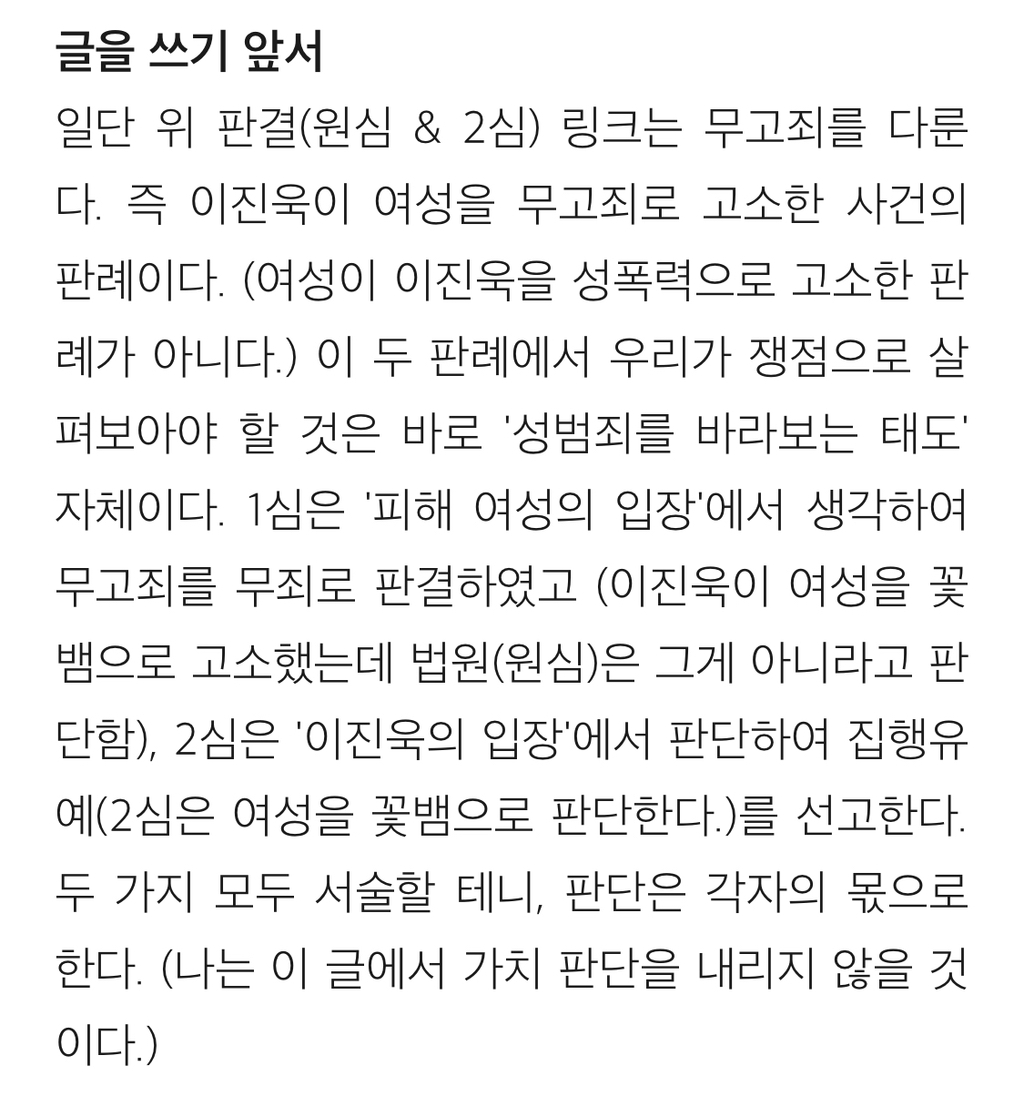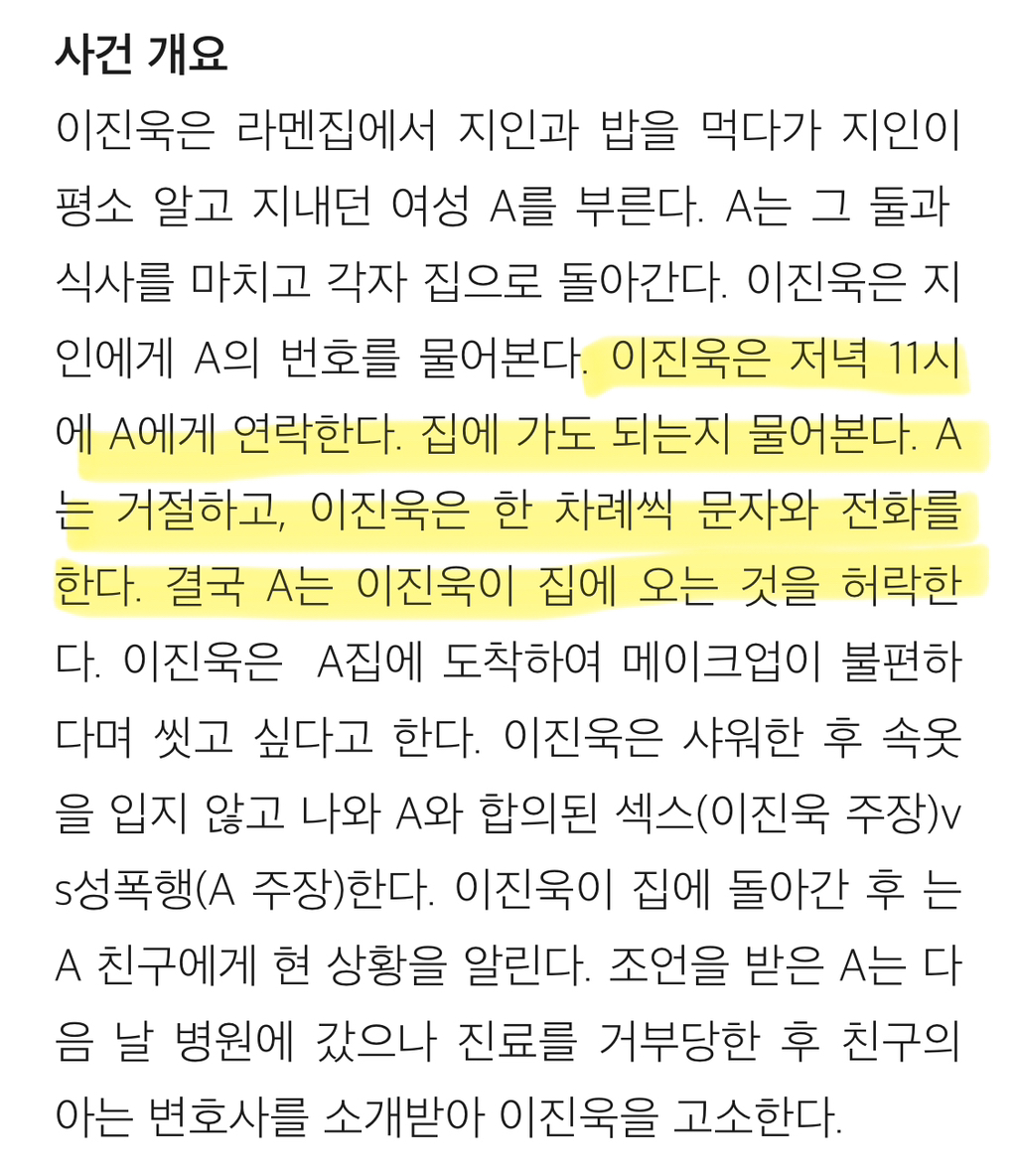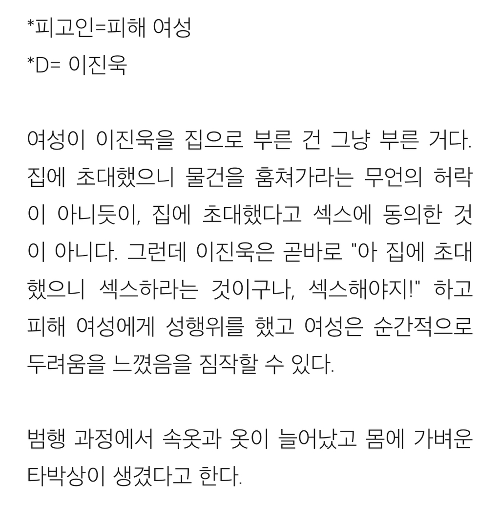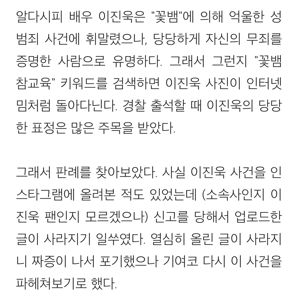 [흥미돋]배우 이진욱 성폭력 vs 무고죄 사건의 전말 작성자gargantuan|작성시간24.11.02|조회수54,554 목록 댓글 238 글자크기 작게가 글자크기 크게가 출처: https://brunch.co.kr/@psnw14/52배우 이진욱 성폭력-무고죄 사건의 진짜 전말(표지 사진 출처: 마이데일리, https://entertain.naver.com/read?oid=117&aid=0002789822) 알다시피 배우 이진욱은 "꽃뱀"에 의해 억울한 성범죄 사건에 휘말렸으나, 당당하게 자신의 무죄를 증명한 사람으로 유brunch.co.kr뒷 내용 더 있으니 링크 들어가서 읽어보길 다음검색 현재 게시글 추가 기능 열기 북마크 공유하기 신고 센터로 신고 댓글 댓글 238 댓글쓰기 답글쓰기 댓글 리스트 작성자구름핑 | 작성시간 24.11.05 아 개빡친다 진짜 작성자에리카 헲 | 작성시간 24.11.05 피해자분 어떡하냐 진짜… 잘 지내고 계시려나 ㅜㅜ 너무 걱정된다 작성자피카츄파이리꼬부기 | 작성시간 24.11.05 개빡티네 작성자캯퉤 | 작성시간 24.11.10 이래서 이진욱 싫어함 저 당당하단 얼굴표정은 뭔데 작성자둥가둥스 | 작성시간 25.12.07 와몰랐어 댓글 전체보기