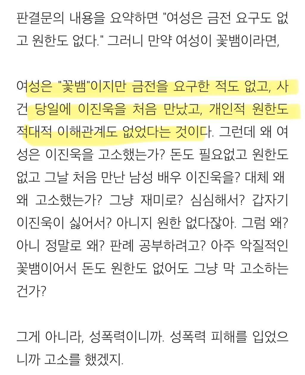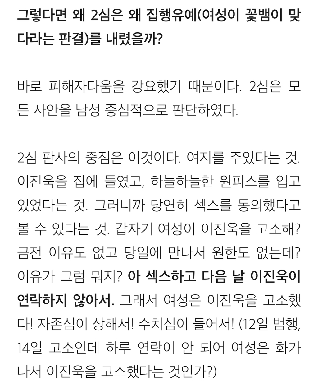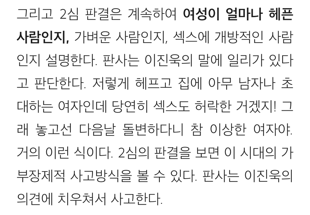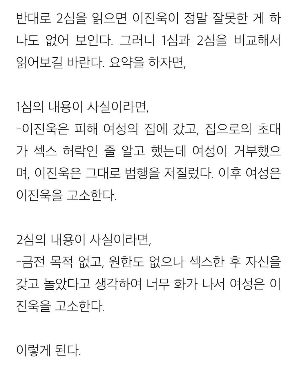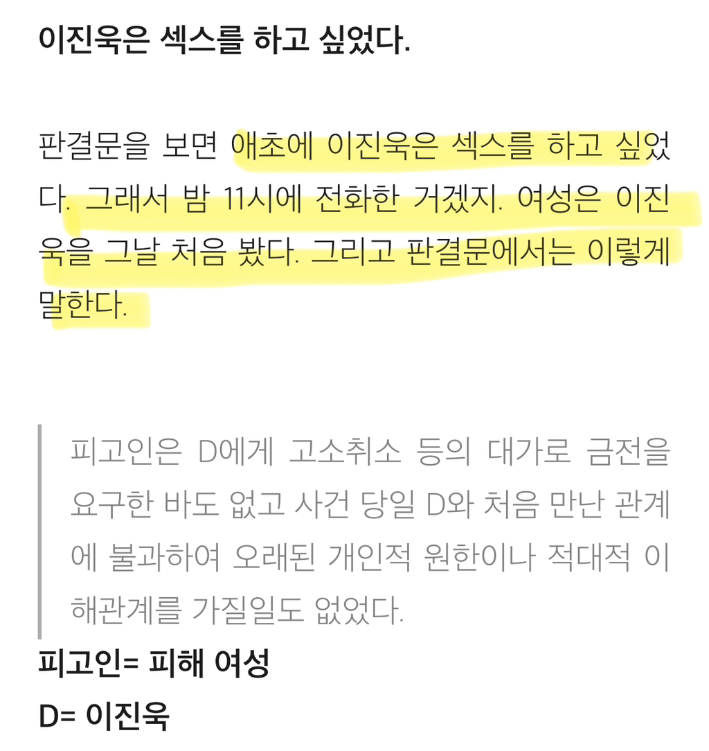 [흥미돋]배우 이진욱 성폭력 vs 무고죄 사건의 전말 작성자gargantuan|작성시간24.11.02|조회수54,554 목록 댓글 238 글자크기 작게가 글자크기 크게가 출처: https://brunch.co.kr/@psnw14/52배우 이진욱 성폭력-무고죄 사건의 진짜 전말(표지 사진 출처: 마이데일리, https://entertain.naver.com/read?oid=117&aid=0002789822) 알다시피 배우 이진욱은 "꽃뱀"에 의해 억울한 성범죄 사건에 휘말렸으나, 당당하게 자신의 무죄를 증명한 사람으로 유brunch.co.kr뒷 내용 더 있으니 링크 들어가서 읽어보길 다음검색 현재 게시글 추가 기능 열기 북마크 공유하기 신고 센터로 신고 댓글 댓글 238 댓글쓰기 답글쓰기 댓글 리스트 작성자구름핑 | 작성시간 24.11.05 아 개빡친다 진짜 작성자에리카 헲 | 작성시간 24.11.05 피해자분 어떡하냐 진짜… 잘 지내고 계시려나 ㅜㅜ 너무 걱정된다 작성자피카츄파이리꼬부기 | 작성시간 24.11.05 개빡티네 작성자캯퉤 | 작성시간 24.11.10 이래서 이진욱 싫어함 저 당당하단 얼굴표정은 뭔데 작성자둥가둥스 | 작성시간 25.12.07 와몰랐어 댓글 전체보기