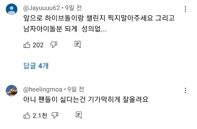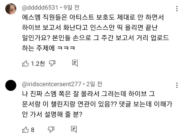 하이브 보고서 유출 사건때문에 유튜브 댓글도 반응안좋음