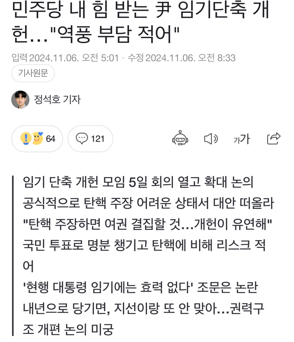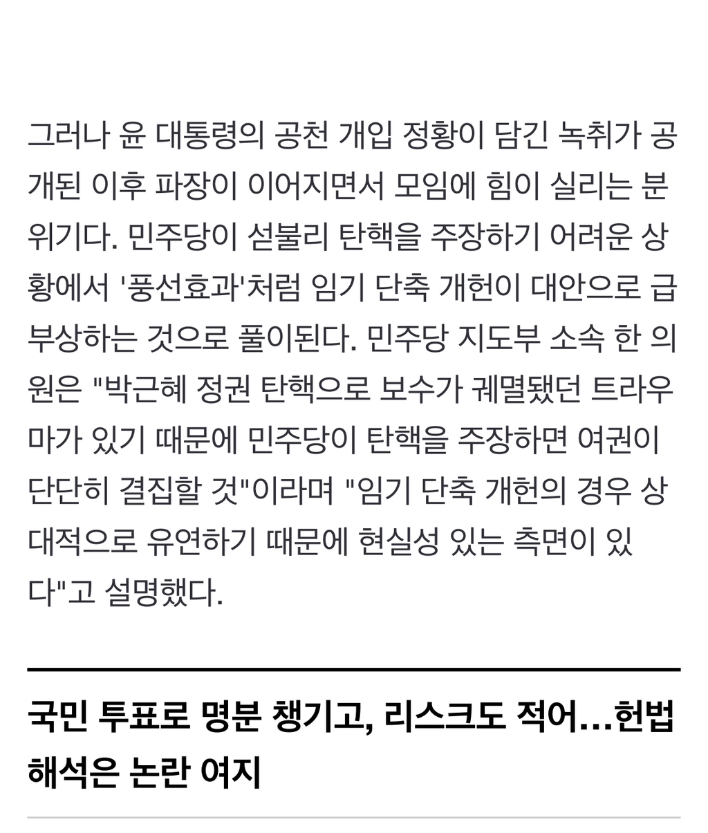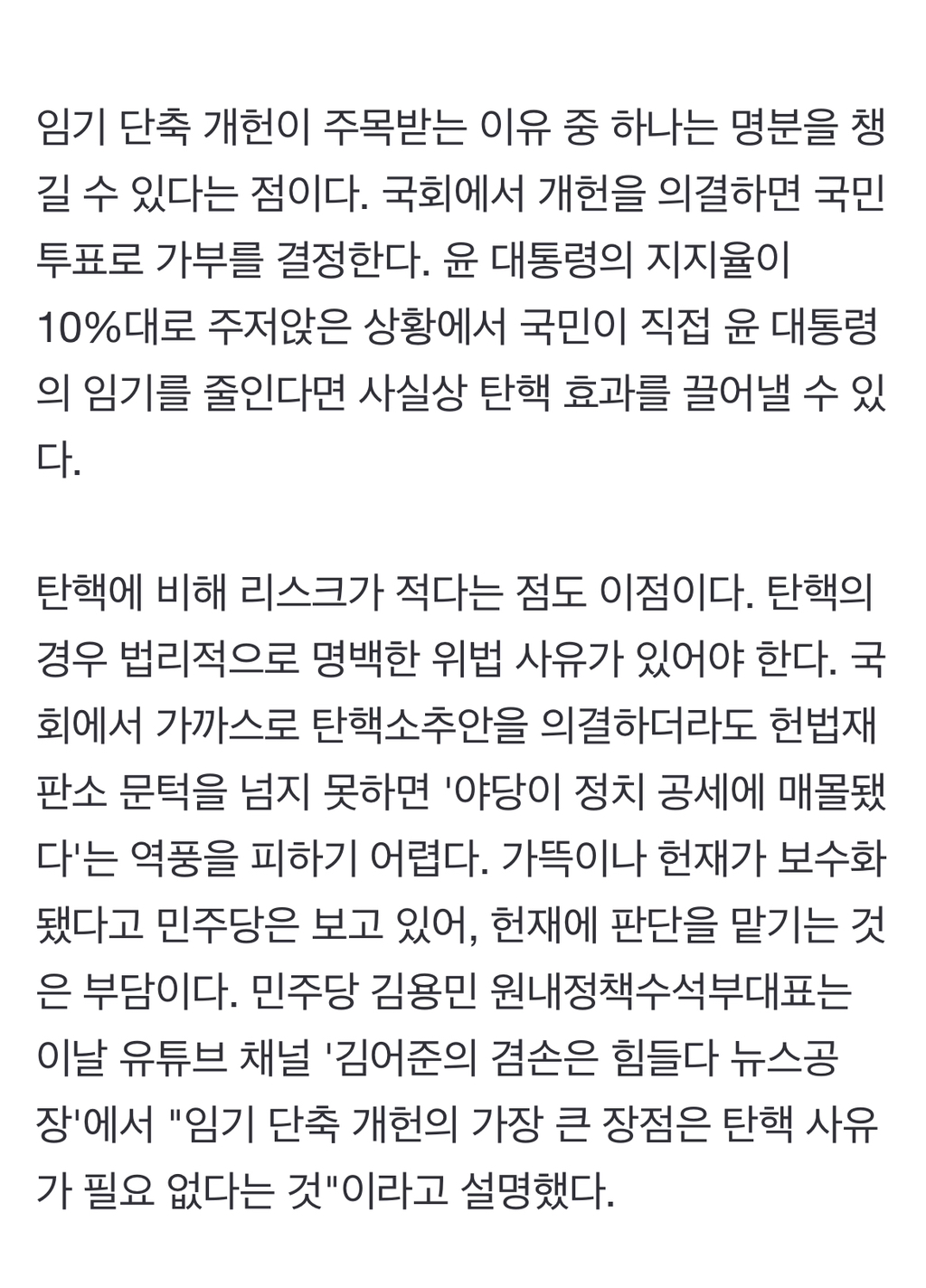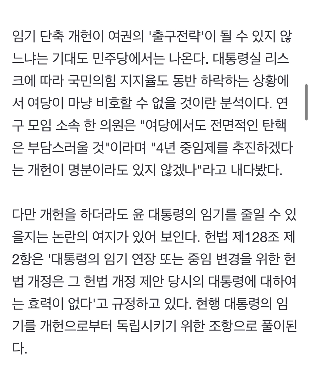 [여시뉴스데스크]민주당 내 힘 받는 尹 임기단축 개헌…"역풍 부담 적어 작성자빱뺩뻡뼙|작성시간24.11.06|조회수1,146 목록 댓글 16 글자크기 작게가 글자크기 크게가 출처: https://n.news.naver.com/article/079/0003955729?sid=100민주당 내 힘 받는 尹 임기단축 개헌…"역풍 부담 적어"더불어민주당 등 야당이 수면 아래에서 개헌을 통한 대통령 임기 제한을 추진 중이다. 윤석열 대통령의 임기를 2년 줄여 내년 5월 대선을 치르자는 주장이다. 민주당에서는 임기 제한이 국민투n.news.naver.com전문 출처로 다음검색 현재 게시글 추가 기능 열기 북마크 공유하기 신고 센터로 신고 댓글 댓글 16 댓글쓰기 답글쓰기 댓글 리스트 작성자취객 | 작성시간 24.11.06 탄핵 된다는 보장도 없어 헌법재판소 국힘픽 및 윤석열픽 재판관으로 가득 찼음ㅎ 작성자쏘쏭 | 작성시간 24.11.06 고고 제발 제발 ㅠ 작성자감자옹심 | 작성시간 24.11.06 어떻게든 끌어내리자; 작성자골치골치 | 작성시간 24.11.06 국민투표 해줘!! 나 당장 할래!! 작성자알래스카피쉬스낵딥치즈 | 작성시간 24.11.06 빨리요 빨리 댓글 전체보기