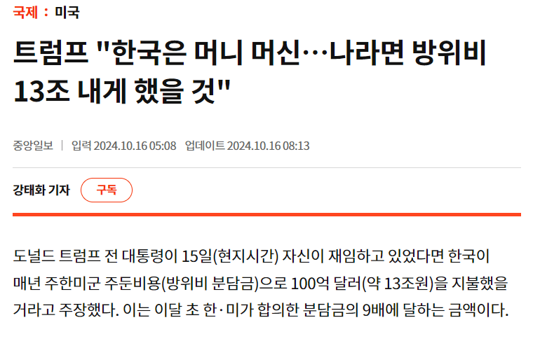 "한국이 주한미군 주둔 비용으로 연간 100억 달러(13조 6500억)을 지불할 것"