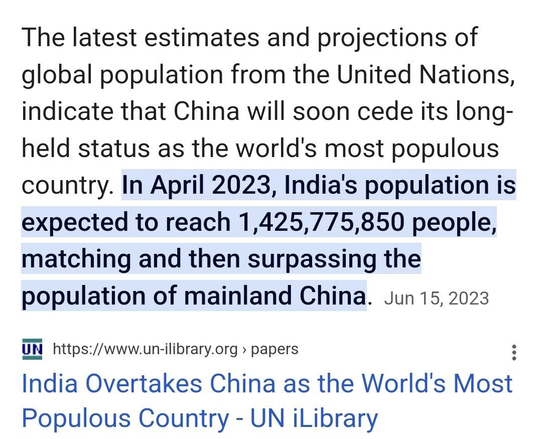 얼마전까지만 해도 인구로 세계 1위었던 중국. 최근 출산율 급락으로 인한 인구 감소로, 인도에게 그 자리를 내주고 세계 2위로 떨어짐.