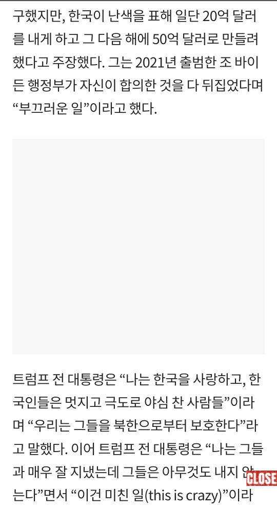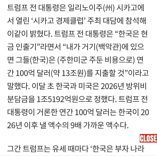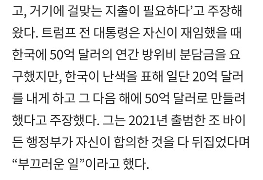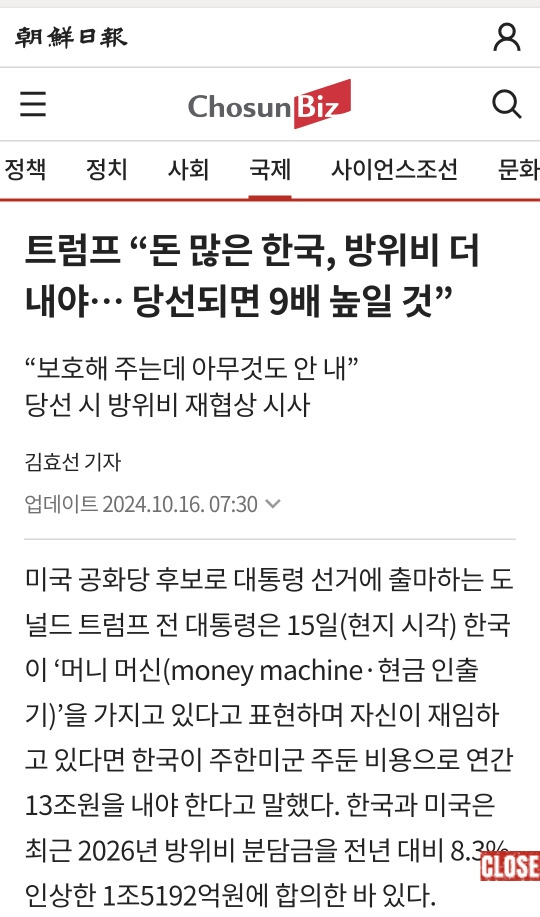 [여시뉴스데스크]트럼프 "돈 많은 한국, 방위비 더 내야.." 당선되면 9배 높일 것 작성자여시하는여시|작성시간24.11.06|조회수24,507 목록 댓글 283 글자크기 작게가 글자크기 크게가 출처: 여시하는여시https://biz.chosun.com/international/international_general/2024/10/16/P53ITOVNZVCF3BUUHDN3FHLEIY/트럼프 “돈 많은 한국, 방위비 더 내야… 당선되면 9배 높일 것”트럼프 돈 많은 한국, 방위비 더 내야 당선되면 9배 높일 것 보호해 주는데 아무것도 안 내 당선 시 방위비 재협상 시사biz.chosun.com자세한건 링크 참조 다음검색 현재 게시글 추가 기능 열기 북마크 공유하기 신고 센터로 신고 댓글 댓글 283 댓글쓰기 답글쓰기 댓글 리스트 작성자돈이넘치는여시 | 작성시간 24.11.07 한국이요 …? 작성자Doctor Strange | 작성시간 24.11.07 시발 작성자닭발에 계란찜 먹고싶다 | 작성시간 24.11.07 미친새끼야 작성자기여워라 | 작성시간 24.11.07 하 작성자수제애비 | 작성시간 24.11.07 살려조요 댓글 전체보기