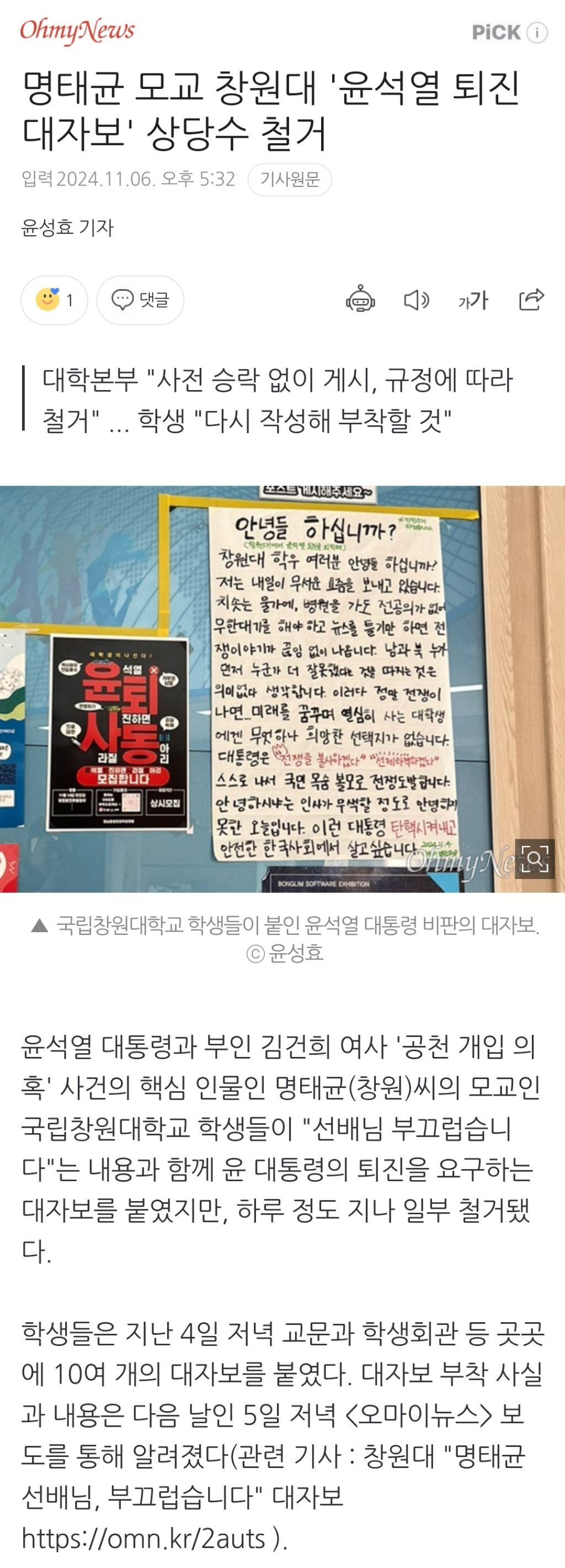 [여시뉴스데스크]명태균 모교 창원대 '윤석열 퇴진 대자보' 상당수 철거 작성자천리길|작성시간24.11.06|조회수1,374 목록 댓글 2 글자크기 작게가 글자크기 크게가 출처: https://naver.me/54LHgxE6명태균 모교 창원대 '윤석열 퇴진 대자보' 상당수 철거▲ 국립창원대학교 학생들이 붙인 윤석열 대통령 비판의 대자보. ⓒ 윤성효 윤석열 대통령과 부인 김건희 여사 '공천 개입 의혹' 사건의 핵심 인물인 명태균(창원)씨의 모교인 국립창원대학교 n.news.naver.com이하 생략전문 출처로🔗관련 기사https://naver.me/55r6QmCG창원대 "명태균 선배님, 부끄럽습니다" 대자보▲ 국립창원대학교에 4일 저녁에 붙은 대자보. ⓒ 윤성효 "뉴스를 보며 역사왜곡문제들이 너무 화가 나서 글을 썼습니다." "창원대를 졸업하신 명태균 선배님. 선배님은 창원대의 수치입니다." "n.news.naver.comhttps://naver.me/GHvznv2y‘명태균 모교’ 국립창원대에 “선배님, 부끄럽습니다” 대자보 등장“선배님, 부끄럽습니다” ‘대통령 부부의 공천 개입 의혹’의 핵심인물인 명태균씨의 모교인 국립창원대학교에 윤석열 정부를 비판하는 대자보가 곳곳에 등장했다. 대학 측은 ‘학교 규정에n.news.naver.com 다음검색 현재 게시글 추가 기능 열기 북마크 공유하기 신고 센터로 신고 댓글 댓글 2 댓글쓰기 답글쓰기 댓글 리스트 작성자토핑추가추가추가 | 작성시간 24.11.06 창원대학생들 잘한다 계속 대자보 써붙이고 쪽팔린다고 졸업장 뺏자고 하자 작성자안녕과안녕으로 | 작성시간 24.11.06 학생들 화이팅..!!! 댓글 전체보기