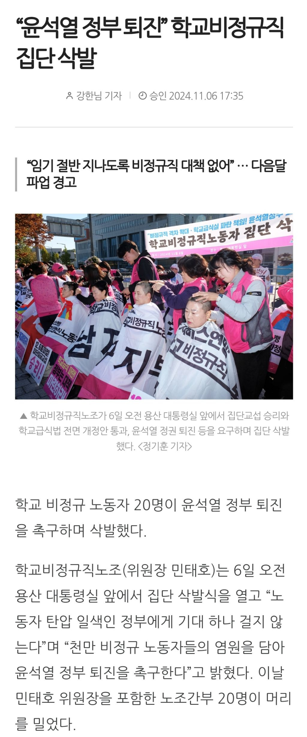 [여시뉴스데스크]“윤석열 정부 퇴진” 학교비정규직 집단 삭발 작성자천리길|작성시간24.11.06|조회수1,120 목록 댓글 1 글자크기 작게가 글자크기 크게가 출처: http://www.labortoday.co.kr/news/articleView.html?idxno=224538“윤석열 정부 퇴진” 학교비정규직 집단 삭발 - 매일노동뉴스학교 비정규 노동자 20명이 윤석열 정부 퇴진을 촉구하며 삭발했다.학교비정규직노조(위원장 민태호)는 6일 오전 용산 대통령실 앞에서 집단 삭발식을 열고 “노동자 탄압 일색인 정부에게 기대www.labortoday.co.kr이하 생략전문 출처로 다음검색 현재 게시글 추가 기능 열기 북마크 공유하기 신고 센터로 신고 댓글 댓글 1 댓글쓰기 답글쓰기 댓글 리스트 작성자뽀리신 | 작성시간 24.11.06 역시 큰일은 여자가 댓글 전체보기