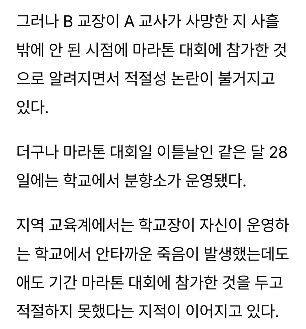 [여시뉴스데스크][단독] 특수교사 사망 애도 기간 강원도서 마라톤 즐긴 학교장 도마 작성자쟬리켓|작성시간24.11.06|조회수2,789 목록 댓글 12 글자크기 작게가 글자크기 크게가 출처: https://www.incheonilbo.com/news/articleView.html?idxno=1270179[단독] 특수교사 사망 애도 기간 강원도서 마라톤 즐긴 학교장 도마지난달 격무에 시달리다 숨진 특수교사가 다녔던 초등학교 교장이 추모 분향소가 운영되기도 전에 취미활동을 즐기기 위해 마라톤 대회에 참가한 것으로 확인돼 논란이 일고 있다. 6일 인천일www.incheonilbo.com 다음검색 현재 게시글 추가 기능 열기 북마크 공유하기 신고 센터로 신고 댓글 댓글 12 댓글쓰기 답글쓰기 댓글 리스트 작성자챠닌한 | 작성시간 24.11.06 미친거지 작성자쑥의눈 | 작성시간 24.11.06 쟤네가 그렇지 머 ㅋㅋㅋ 뭘기대해 작성자다가오는스프링 | 작성시간 24.11.06 ㅆ패아냐…? 작성자아르텍굿 | 작성시간 24.11.06 미쳤니 ... 작성자노랑누렁 | 작성시간 24.11.07 대박.. 댓글 전체보기