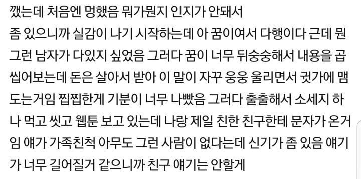 작성자더파이널스트록 작성시간 24.11.09 난 살아서 돈받으라는말에 사망보험금 생각났고 조상신이 도와준거라 생각드는데