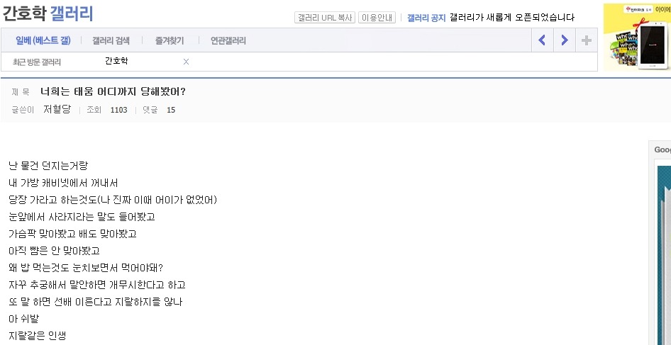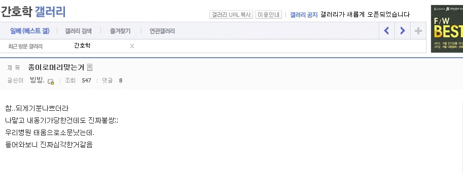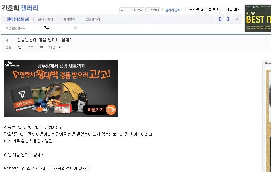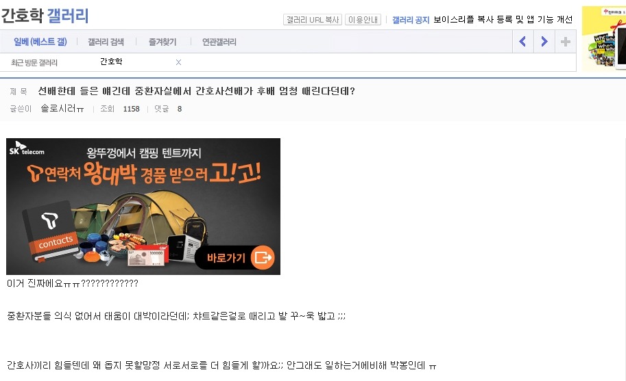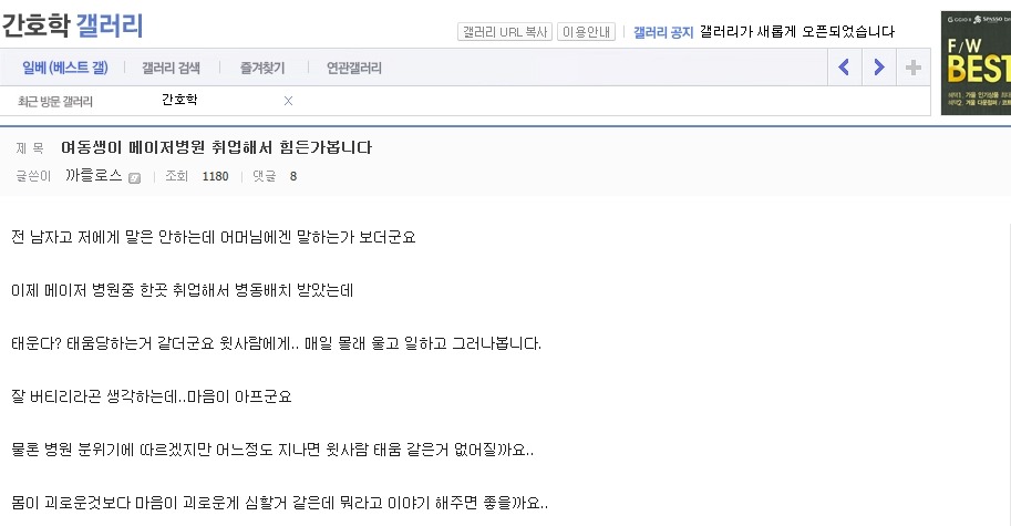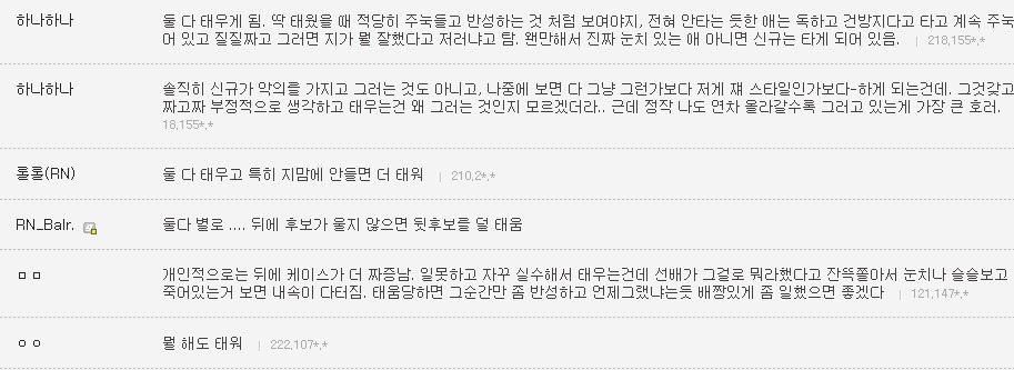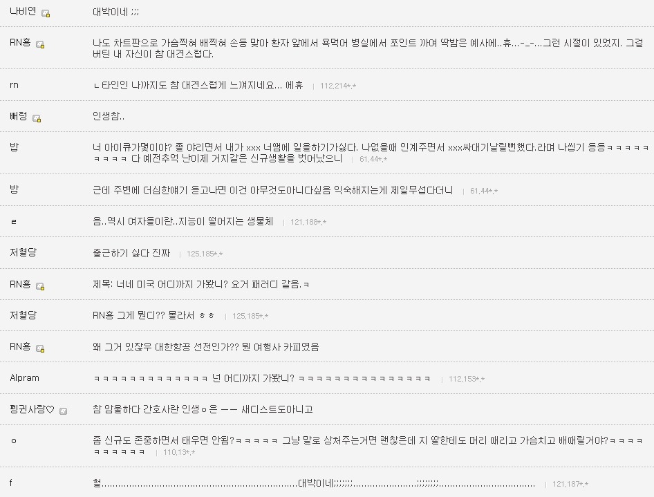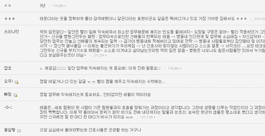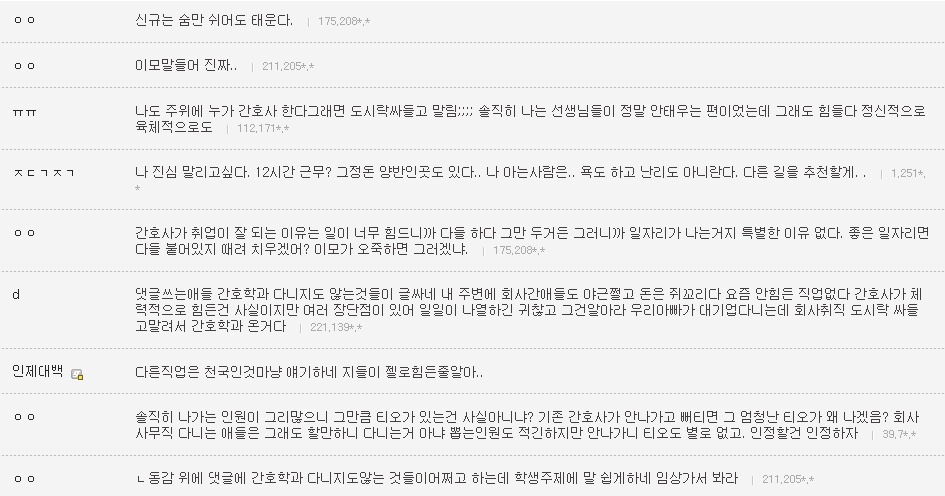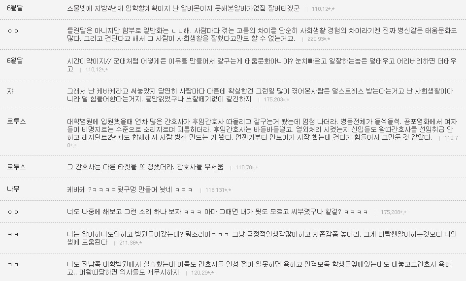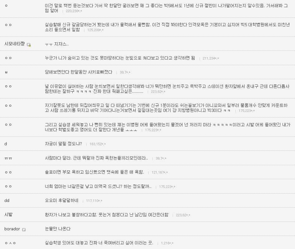 작성자은발성애자 작성시간 13.10.29 난 간3인데 진짜 1학년때부터 엄청 선배들이갈궜음 오죽하면 공부만하고 그런거전혀 관심없는선배들도 내이름은몰라도 내생긴거는 알고있는정도였음..진짜 그땐하루하루 힘들었음...나도내가뭘잘못한지를 모름 선배들은 우리끼리진짜착한동기여도 걍 지들끼리 뭐예쁘다던가, 눈에띈다던가, 무튼뭐하나꼬투리잡으면 겪어보지도않고 뒷담존나까고 술보복쩌럿음 그래서나랑내동기들 그런거 울학년에서싹없앰 없애니까 선배들이 존나지랄지랄함저호구년들하면서 니들이물구리게한다고 암튼...아 대학도솔직히 존나힘들엇는데 태움이라니ㅜㅜㅜㅜ나너무 우울하다..내목표가 탑5중하난데..그래도 실습때쌤들이 나만존나예뻐해줘서 자신감얻어서