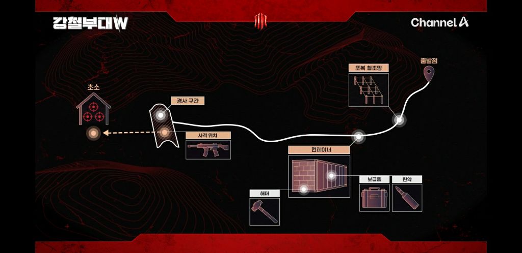 소총 메고 물웅덩이 코스 빠르게 달려가서 ➡️ 후방 포복으로 진창 철조망 통과 ➡️ 헤머로 석벽 부순 후 컨테이너 진입 ➡️ 군장과 탄통, 보급품 획득 ➡️ 쇠창살로 막혀있는 출구 발차기로 타격해서 탈출 ➡️ 군장과 탄통, 80kg보급품 들고 300m이동 ➡️ 급경사 위에 위치해 있는 사격 장소에 올라가 80m 거리 표적 사격 및 초소 폭파