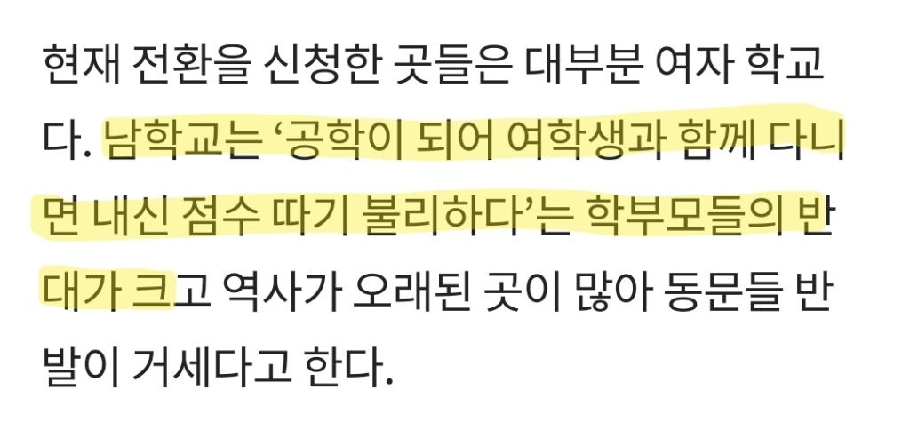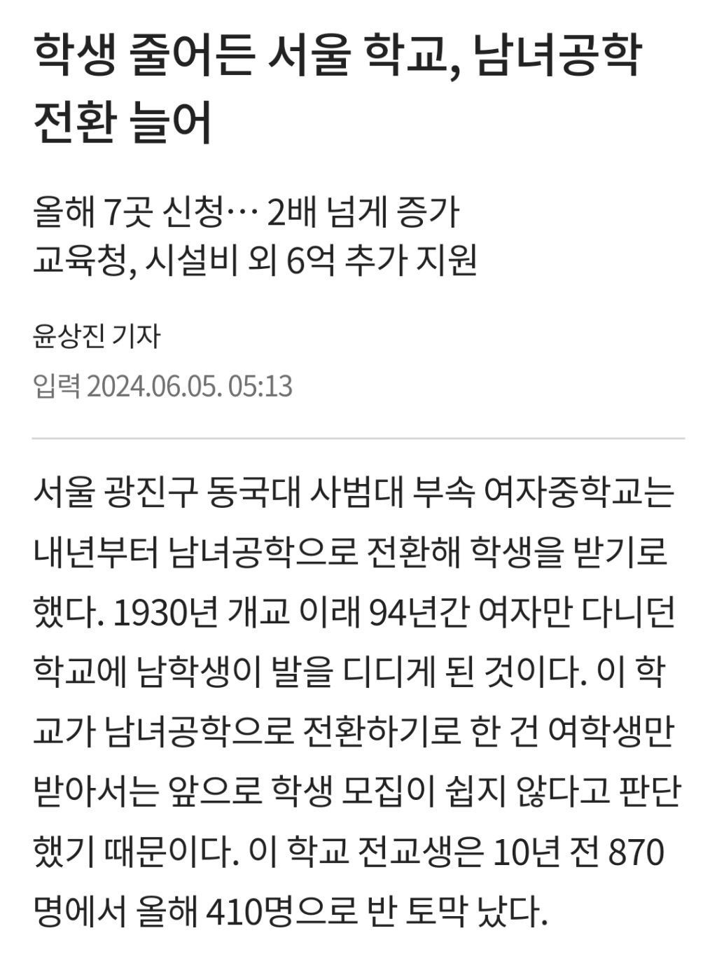 참고로 2025년 3월 1일자로 서울에서 남녀공학으로 전환되는 학교 7개 교인데 전부 여학교임(송곡여중, 동국대사범대부속여중, 동국대사범대부속여고, 송곡관광고, 경복비지니스고, 성암국제무역고, 성동글로벌경영고)