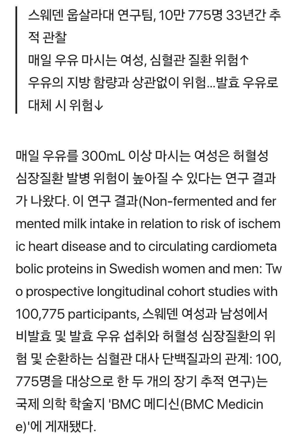 [여시뉴스데스크]우유, 매일 마시면 심혈관 질환 위험↑…요거트는 괜찮다고? 작성자나는 꽃이야|작성시간24.11.13|조회수11,292 목록 댓글 21 글자크기 작게가 글자크기 크게가 출처: https://v.daum.net/v/20241113153020222우유, 매일 마시면 심혈관 질환 위험↑…요거트는 괜찮다고?매일 우유를 300mL 이상 마시는 여성은 허혈성 심장질환 발병 위험이 높아질 수 있다는 연구 결과가 나왔다. 이 연구 결과(Non-fermented and fermented milk intake in relation to risk of ischemic heart disease and to cirv.daum.net...이하 뉴스 본문 참조...매일 매일 라떼만 마시는뎁쇼ㅜㅜ라떼없이 못살아~~ 다음검색 현재 게시글 추가 기능 열기 북마크 공유하기 신고 센터로 신고 댓글 댓글 21 댓글쓰기 답글쓰기 댓글 리스트 작성자베피치 | 작성시간 24.11.13 ㅅㅂ.. 아몬드밀크는 괜창ㅎ나 작성자펴오느 | 작성시간 24.11.13 아침은 시리얼에 우유 아닌가요?ㅜ 작성자자유다야홋 | 작성시간 24.11.13 우유 암세포 어쩌고 인스타에서 봐서 팻지피티한테 물너봤는디 관련성에대한 연구들이 있긴 았었다네 확실한군 아니지만….. 이미지 확대 작성자멍멍텅 | 작성시간 24.11.13 흰우유 제일 좋아하는데... 작성자아이스가이제로 | 작성시간 24.11.13 우유도 안되나 물만먹으라고 ??이런ㅜㅠㅠ 댓글 전체보기