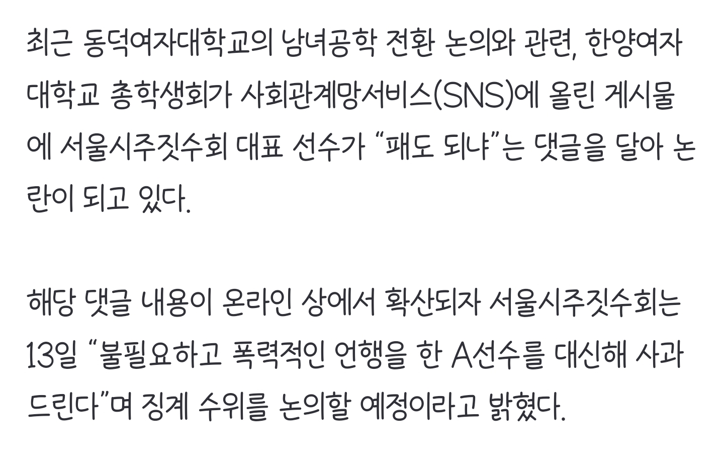 [여시뉴스데스크]“패도 돼?” 주짓수 선수가 여대 학생회에 단 댓글… 징계논의 작성자별뚕별|작성시간24.11.13|조회수4,875 목록 댓글 42 글자크기 작게가 글자크기 크게가 출처: https://naver.me/FvEyz22O“패도 돼?” 주짓수 선수가 여대 학생회에 단 댓글… 징계논의최근 동덕여자대학교의 남녀공학 전환 논의와 관련, 한양여자대학교 총학생회가 사회관계망서비스(SNS)에 올린 게시물에 서울시주짓수회 대표 선수가 “패도 되냐”는 댓글을 달아 논란이 되고n.news.naver.com댓글ㄱㄱ 다음검색 현재 게시글 추가 기능 열기 북마크 공유하기 신고 센터로 신고 댓글 댓글 42 댓글쓰기 답글쓰기 댓글 리스트 작성자사이비극혐 | 작성시간 24.11.13 댓글지원 다녀옴 답댓글 작성자사이비극혐 | 작성시간 24.11.13 여시들 지금 추천 댓글 다 좋다 츄천 꼭 뉼러줘잉 ㅜㅜ옹호댓글은 비추 누르고옴 작성자diamondskys | 작성시간 24.11.13 여시들 댓글 따봉이랑 베댓 대댓 지원좀... 쿵쾅이들 대댓으로 난리중 작성자그러니 내곁에 있으라 | 작성시간 24.11.14 따봉완 작성자펭돌이도리 | 작성시간 24.11.14 프로가 사람 패도 되냐니ㅋㅋㅋㅋㅋㅋ 댓글 전체보기