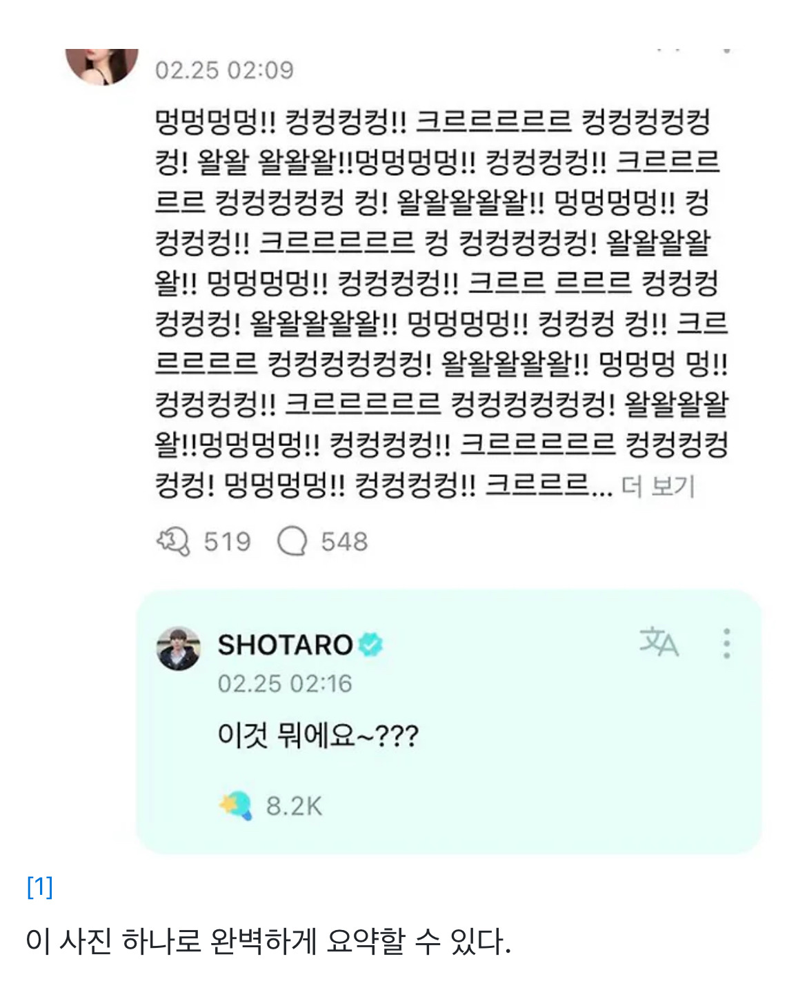 [흥미돋]이것 뭐에요~? 시초 작성자nero|작성시간24.11.14|조회수41,488 목록 댓글 24 글자크기 작게가 글자크기 크게가 출처: 여성시대 nero라이즈의 쇼타로가 Weverse에서 어떤 팬이 본인 마음을 주체하지 못하고 개 짖는 소리(ㅋㅋㅋㅋㅋㅋ)로 주접 드립을 떤 것을 보고 "이것 뭐에요~???"라는 답글을 남긴 데에서 유래한 밈. 이 문장의 포인트는 순진무구하고 다정하지만 의문이 가득 담겨 있는 말투가 포인트!✨ 다음검색 현재 게시글 추가 기능 열기 북마크 공유하기 신고 센터로 신고 댓글 댓글 24 댓글쓰기 답글쓰기 댓글 리스트 작성자비혼이다비혼 | 작성시간 24.11.14 훈아헴 아녔어…? 작성자연금복권로또당첨 나의것이야 | 작성시간 24.11.14 훈아 아녓음? 작성자상어왕 | 작성시간 24.11.14 아 남돌밈이야 심지어 이름이 무ㅜ 쇼타로….? 일본인이야..? 답댓글 작성자쩡은봐주자 | 작성시간 24.11.14 엉 일본인 맞음ㅋㅋㅋㅋ 작성자비흐노. | 작성시간 24.11.14 아기호랑이훈아헴 아녔어???? 댓글 전체보기